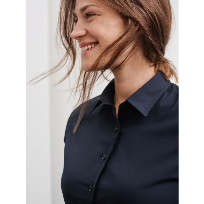 65% poliestere, 35% cotone. Camicia classica con tessuti misti easy care. Poplin easy care. Tessuto esterno (105 g/m²), orlo arrotondato, taglio femminile avvitato, pieghe sul retro.
