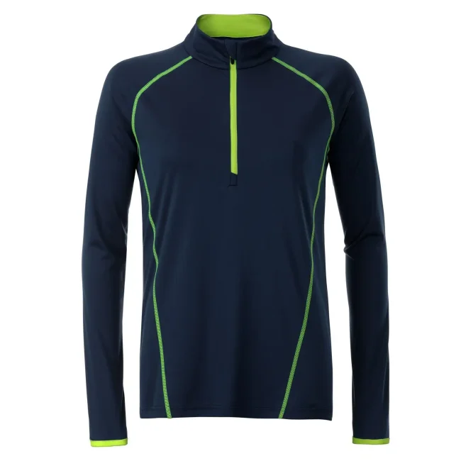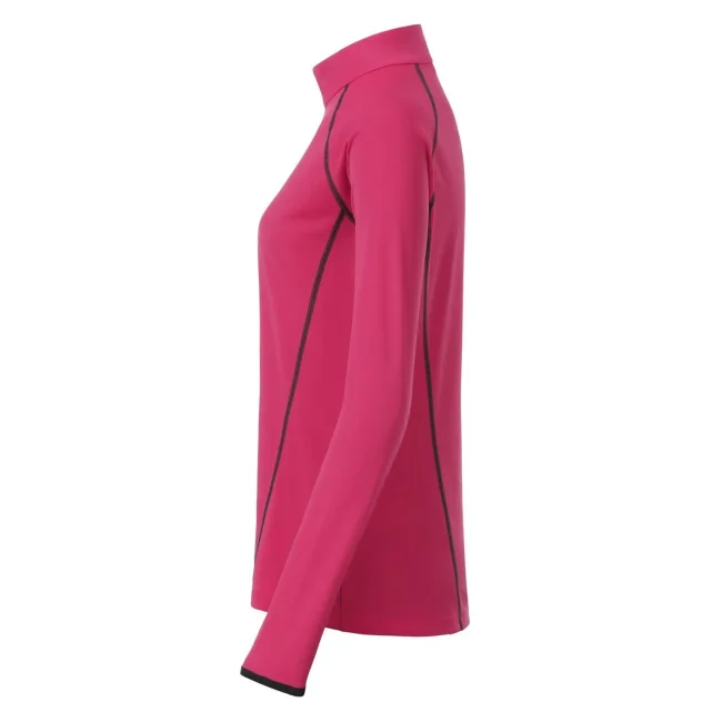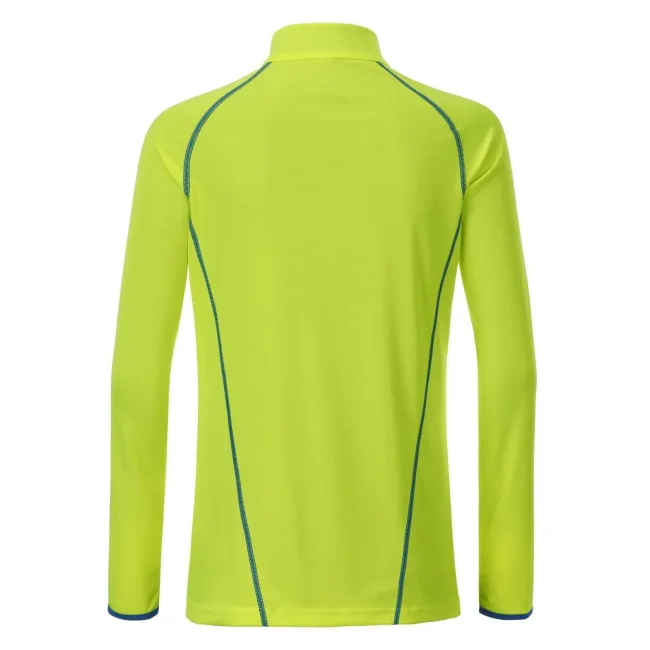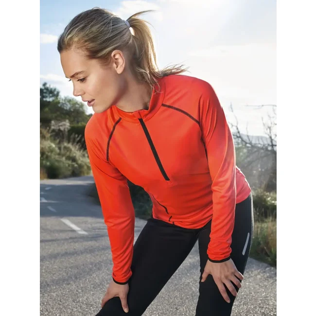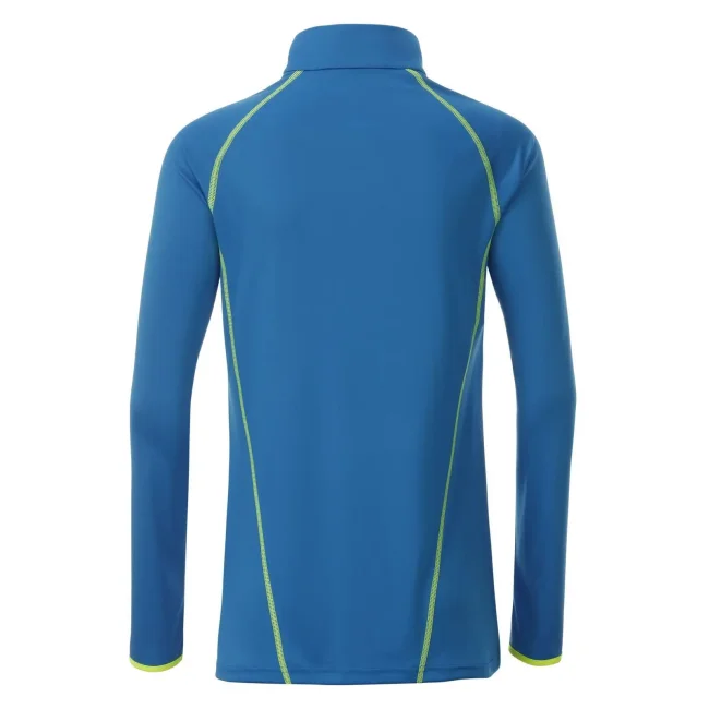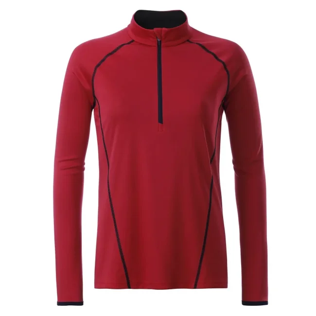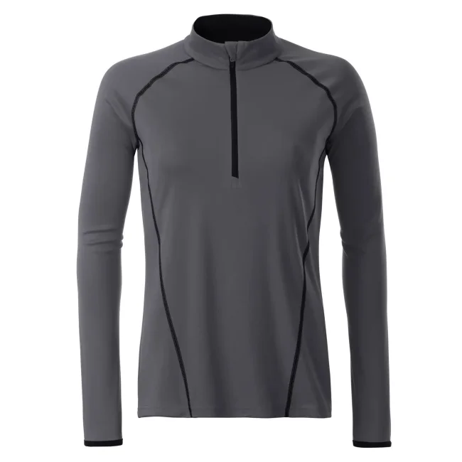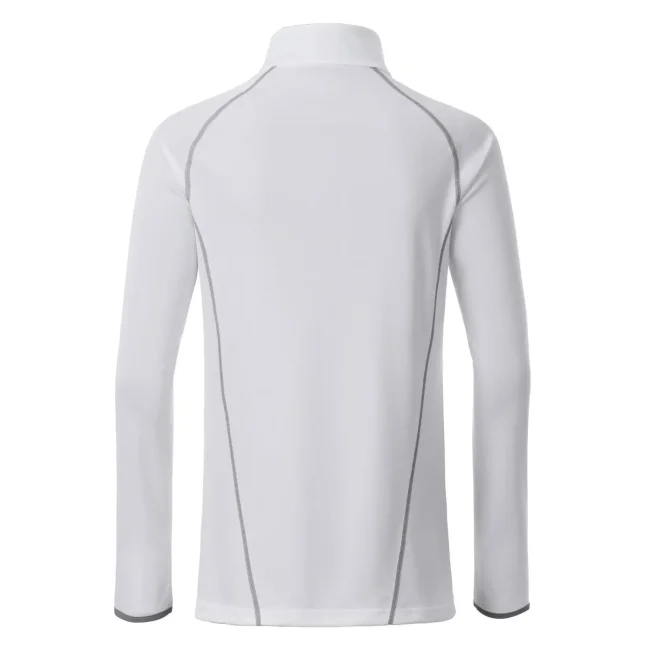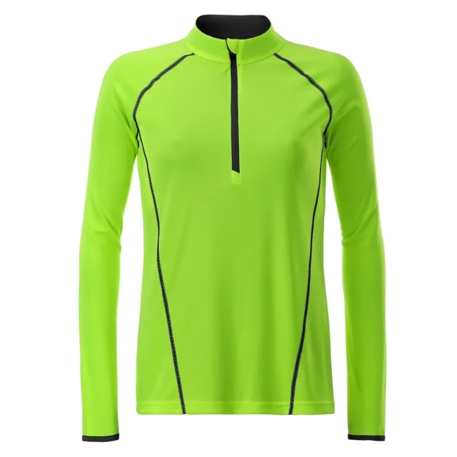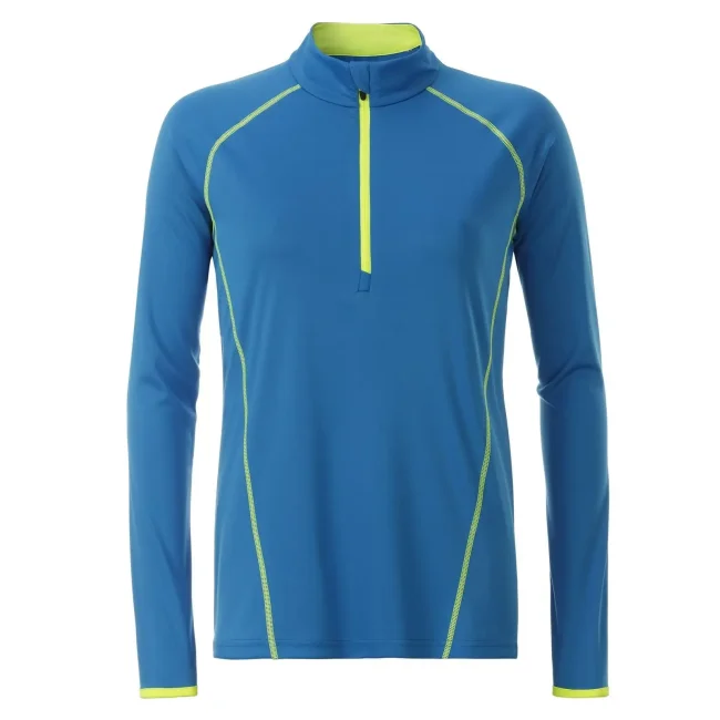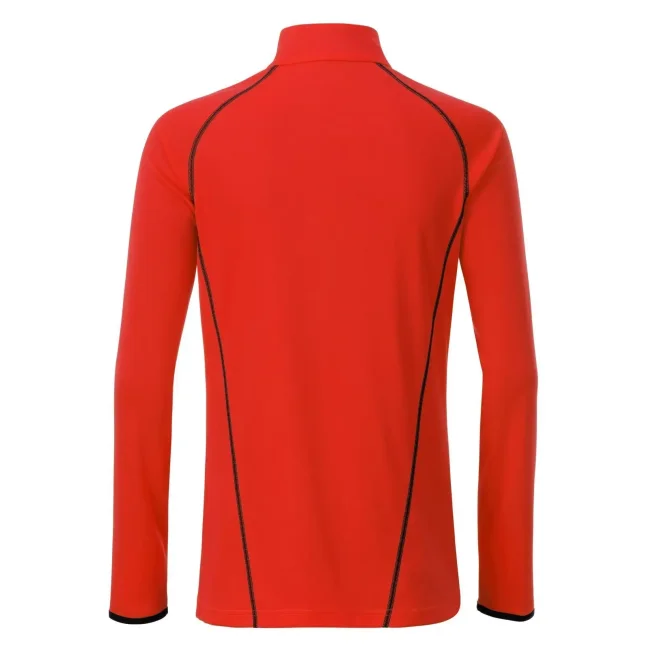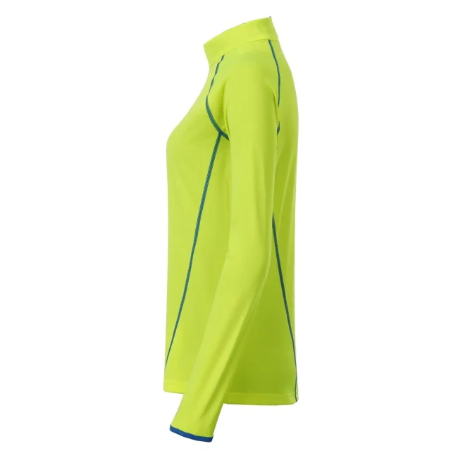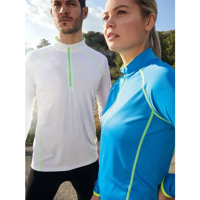 100% poliestere. T shirt manica lunga per fitness e sport Transpirante e con regolazione umidità. Asciugatura rapida, leggera e confortevole. Maniche raglan, collo alto. Cuciture in contrasto sul davanti e sul retro, Zip con protezione per il mento, leggermente avvitata Tessuto esterno (130 g/m²).