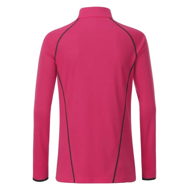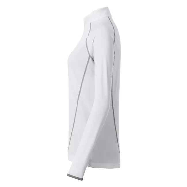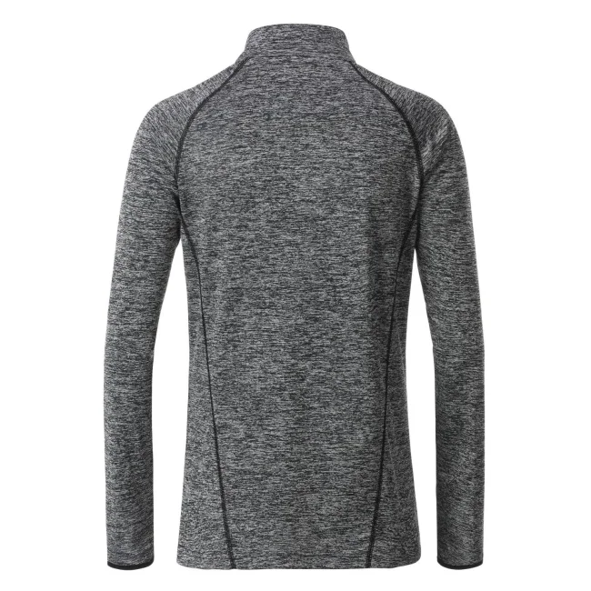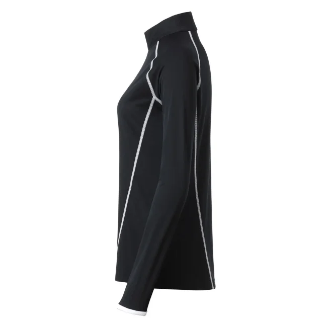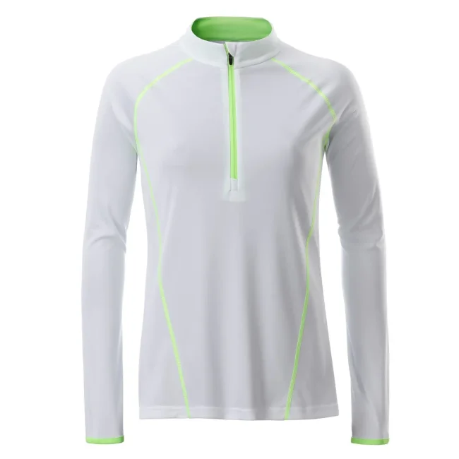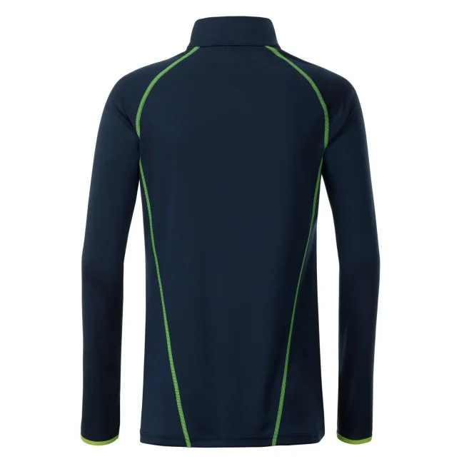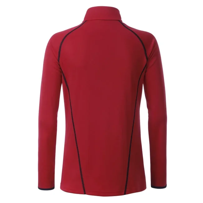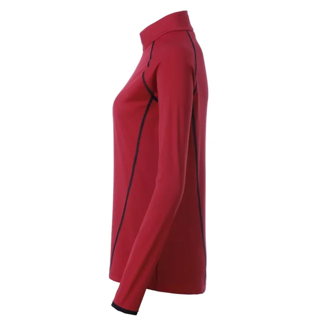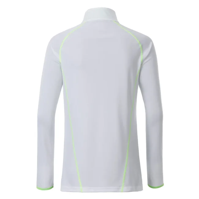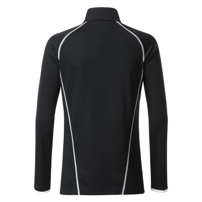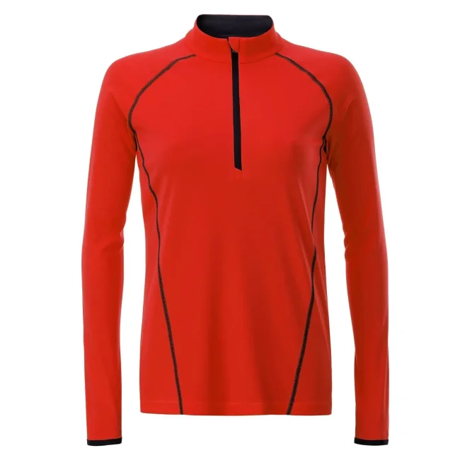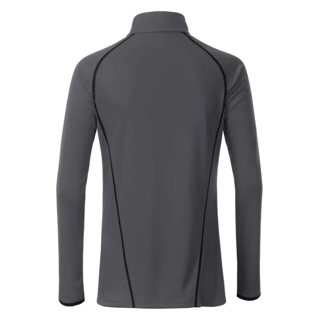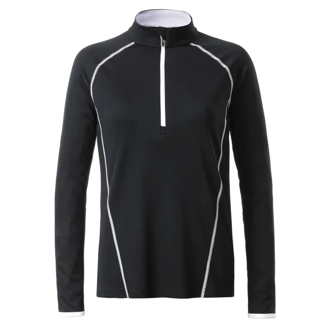 100% poliestere. T shirt manica lunga per fitness e sport Transpirante e con regolazione umidità. Asciugatura rapida, leggera e confortevole. Maniche raglan, collo alto. Cuciture in contrasto sul davanti e sul retro, Zip con protezione per il mento, leggermente avvitata Tessuto esterno (130 g/m²).
