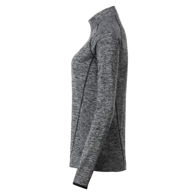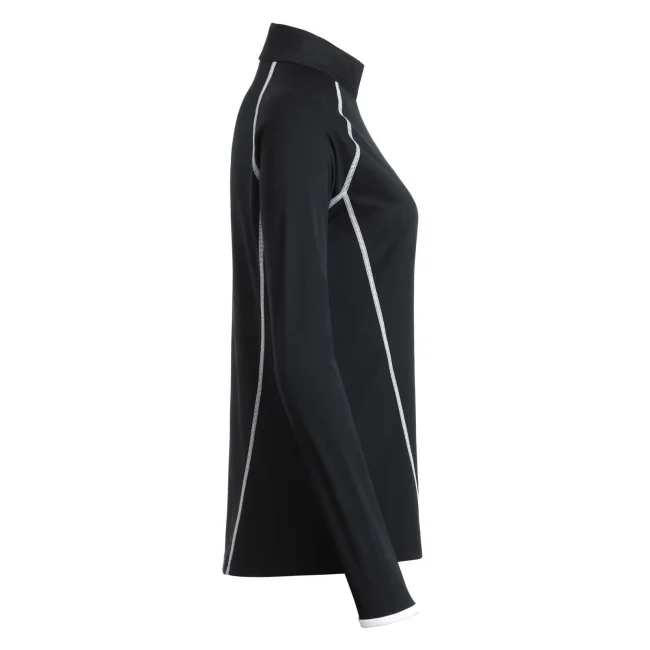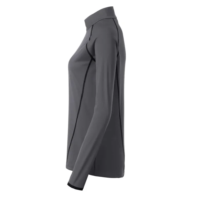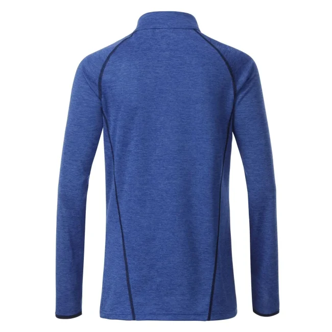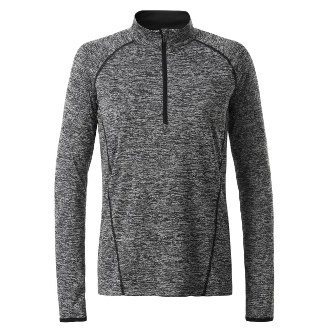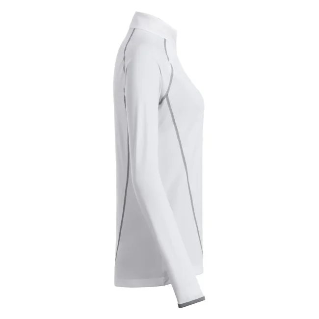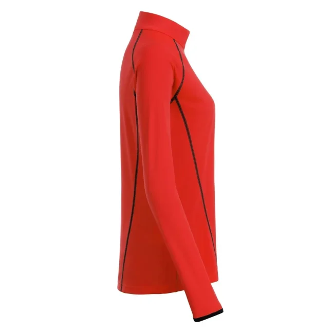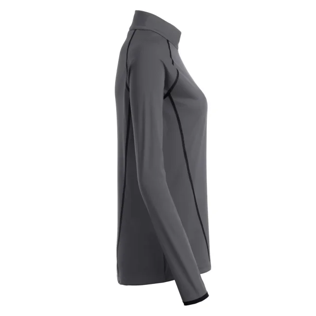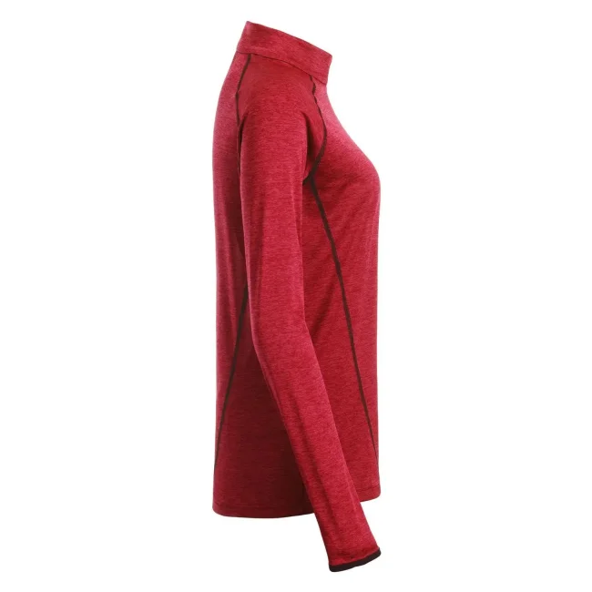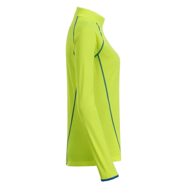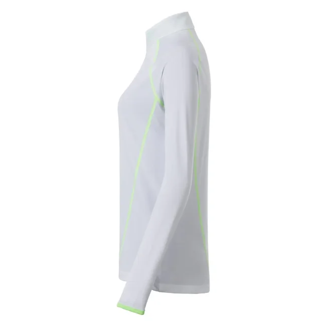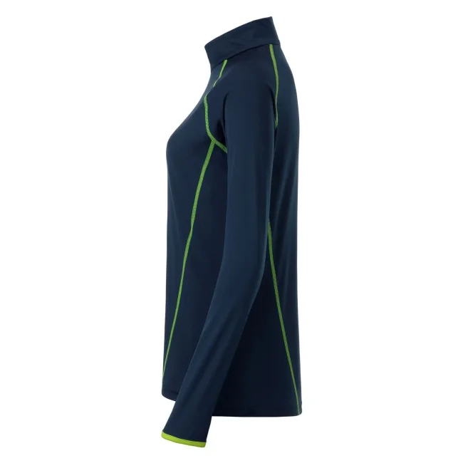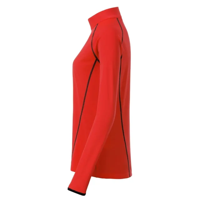100% poliestere. T shirt manica lunga per fitness e sport Transpirante e con regolazione umidità. Asciugatura rapida, leggera e confortevole. Maniche raglan, collo alto. Cuciture in contrasto sul davanti e sul retro, Zip con protezione per il mento, leggermente avvitata Tessuto esterno (130 g/m²).