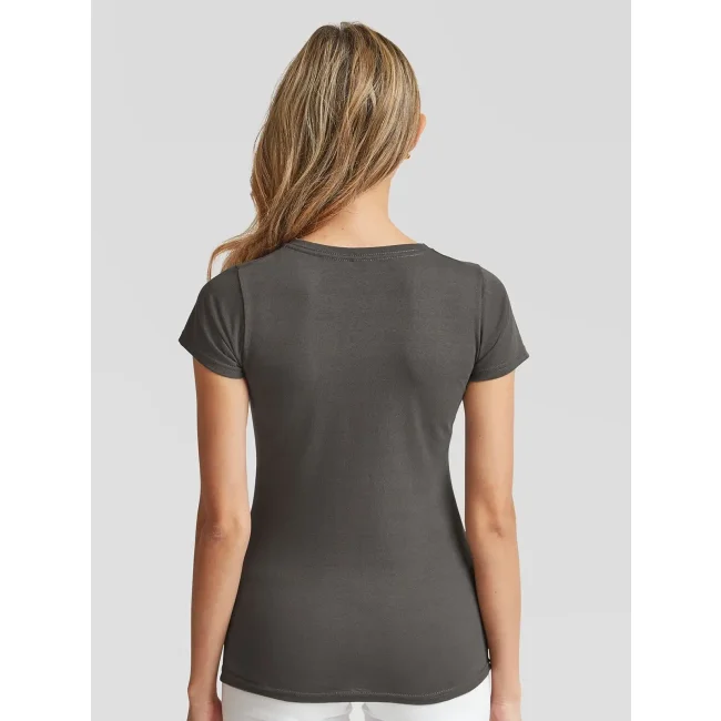 100% cotone filato ad anelli Belcoro. T-shirt manica corta girocollo con costina in cot. e Lycra, fettuccia interna per maggiore comfort, leggermente sfiancata, scollatura femminile, struttura con cuciture laterali. Col. 94: 97% cot. 3% pol. Col. HD, VF, R6, RX, VH: 50% cot. 50% pol. (Col. 30: 160 g/mยฒ).