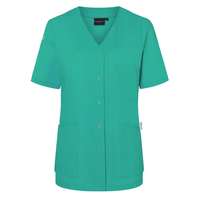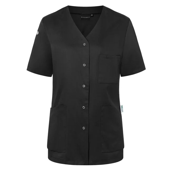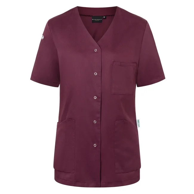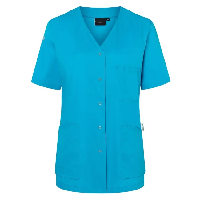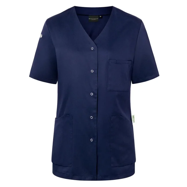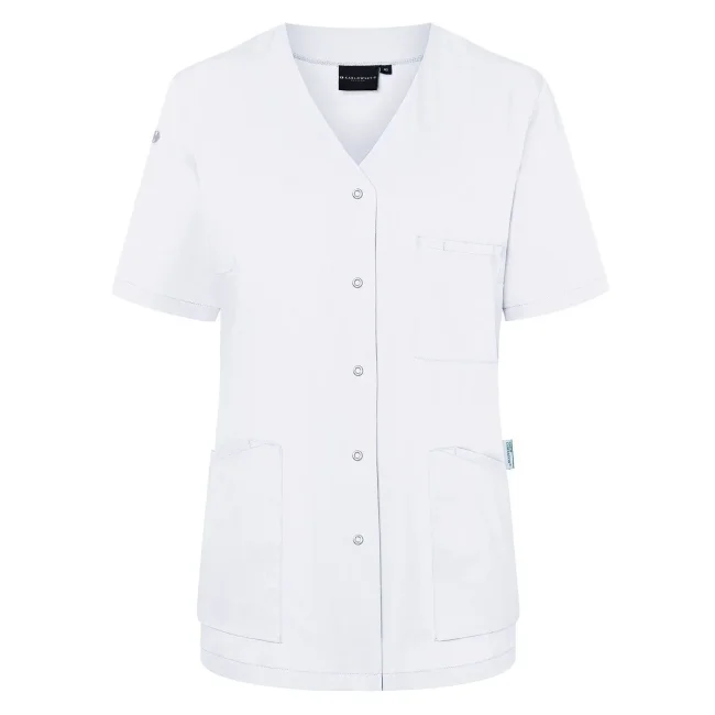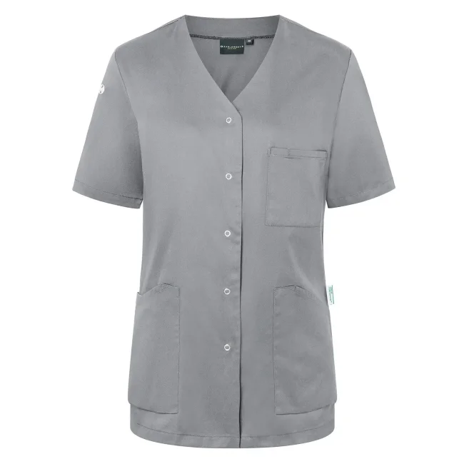 65% poliestere riciclato, 35% cotone. Camice da donna moderno e sostenibile con maniche corte e scollo a V, leggermente sciancrato, 2 tasche laterali con una tasca interna nascosta a destra, passante per porta chiavi nella tasca laterale, 1 taschino porta penne sul petto a sinistra, 5 bottoni automatici.