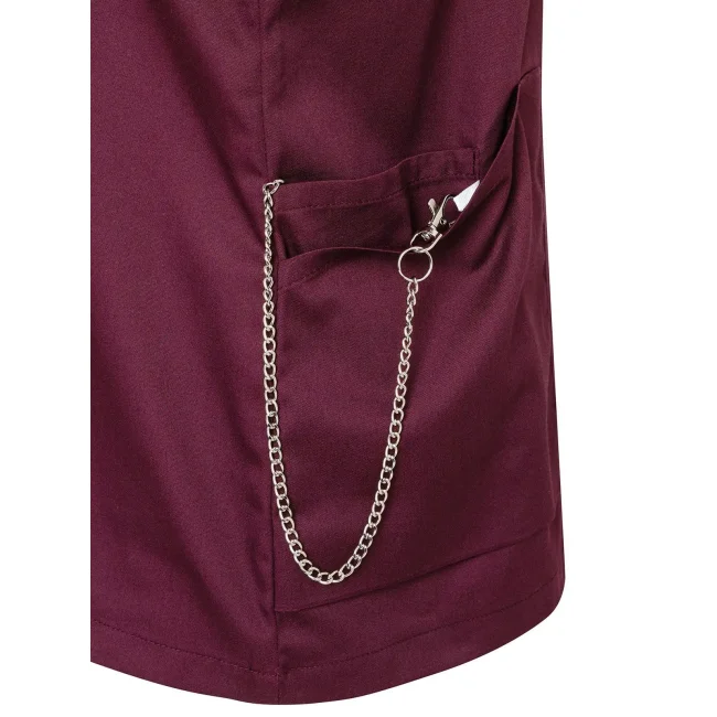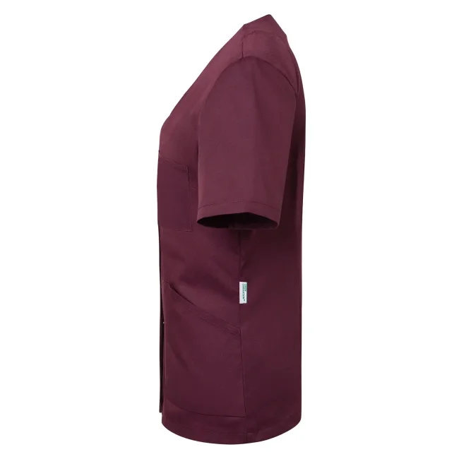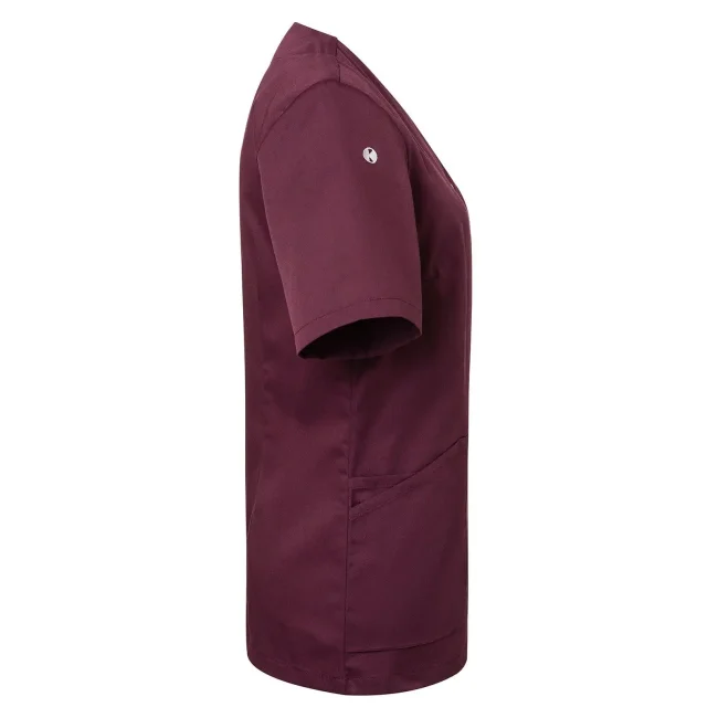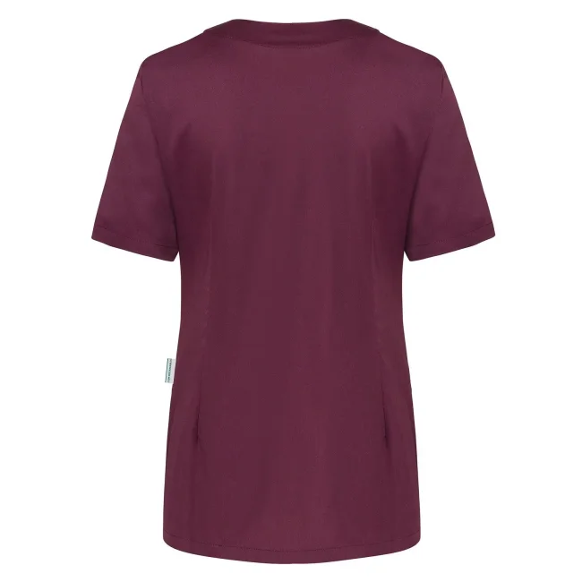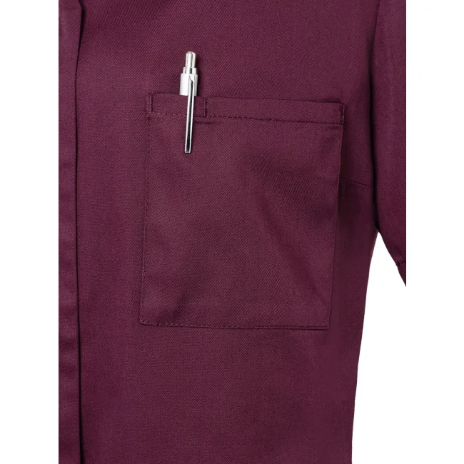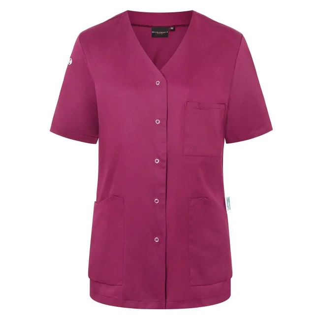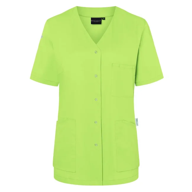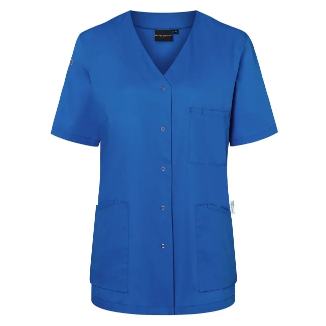 65% poliestere riciclato, 35% cotone. Camice da donna moderno e sostenibile con maniche corte e scollo a V, leggermente sciancrato, 2 tasche laterali con una tasca interna nascosta a destra, passante per porta chiavi nella tasca laterale, 1 taschino porta penne sul petto a sinistra, 5 bottoni automatici.