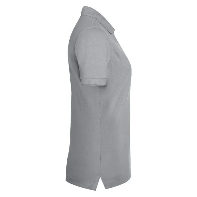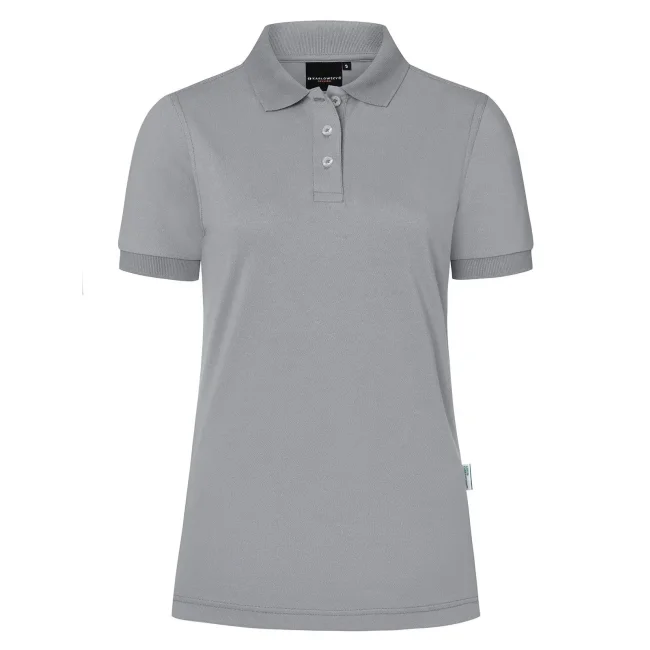 51% poliestere riciclato, 47% cotone, 2% elastan, 220 g/m², jersey-piqué. Polo da donna in materiale resistente e sostenibile, easy-care. Leggermente sfiancata, colletto in maglia con banda di rinforzo, bordi manica in maglia, cuciture doppie, pattina a 3 bottoni a contrasto, spacchetti laterali. Prodotto certificato GRS, Green Button e Oeko-Tex.