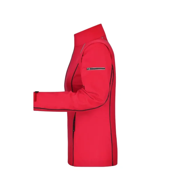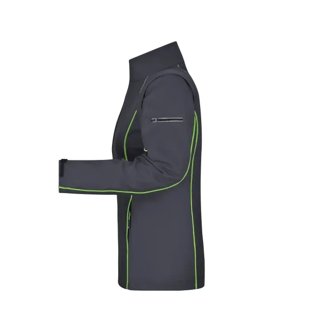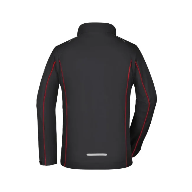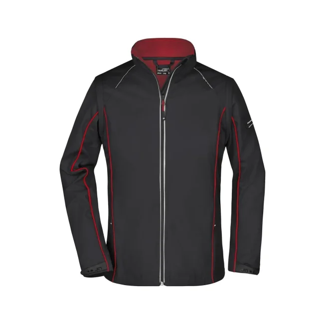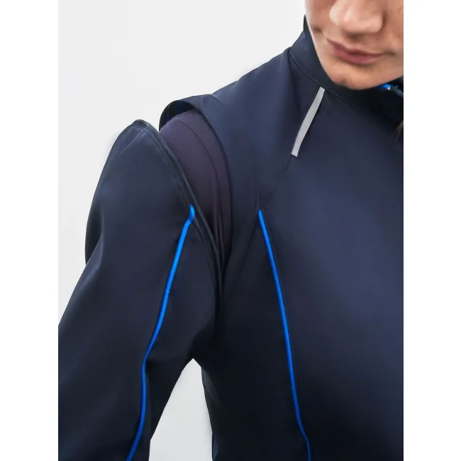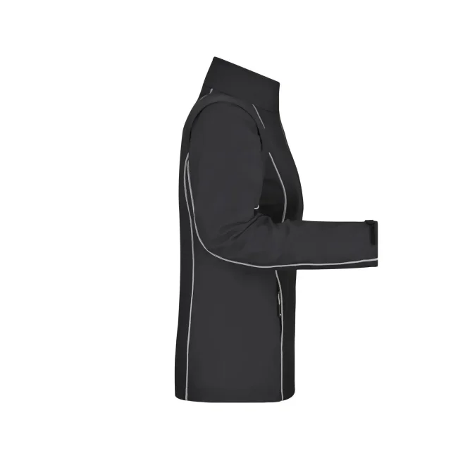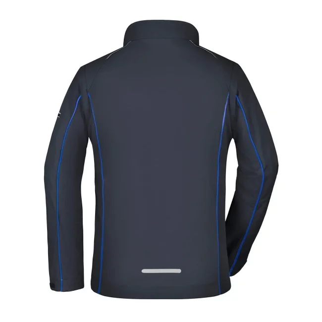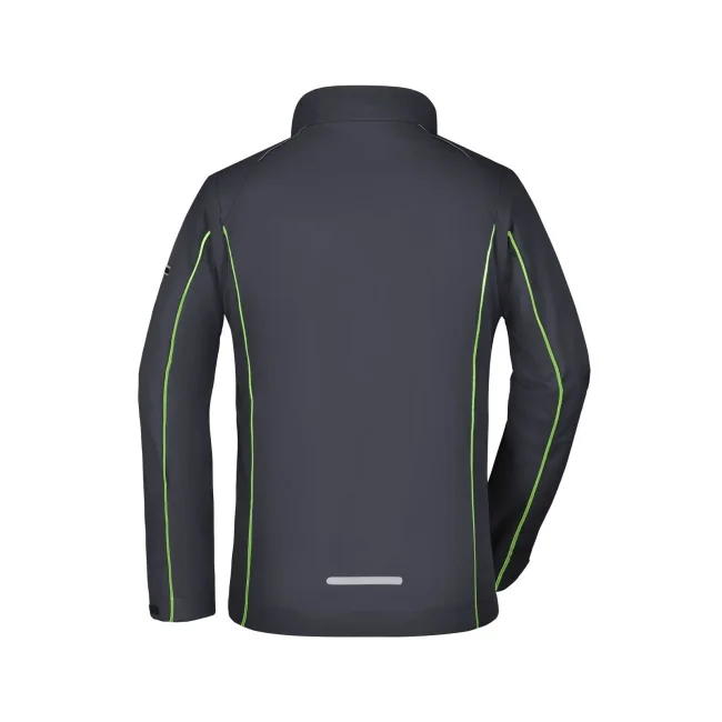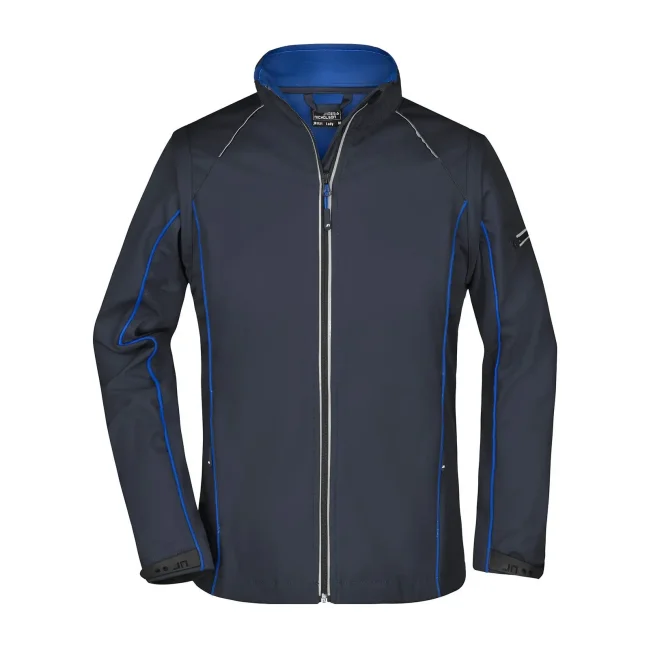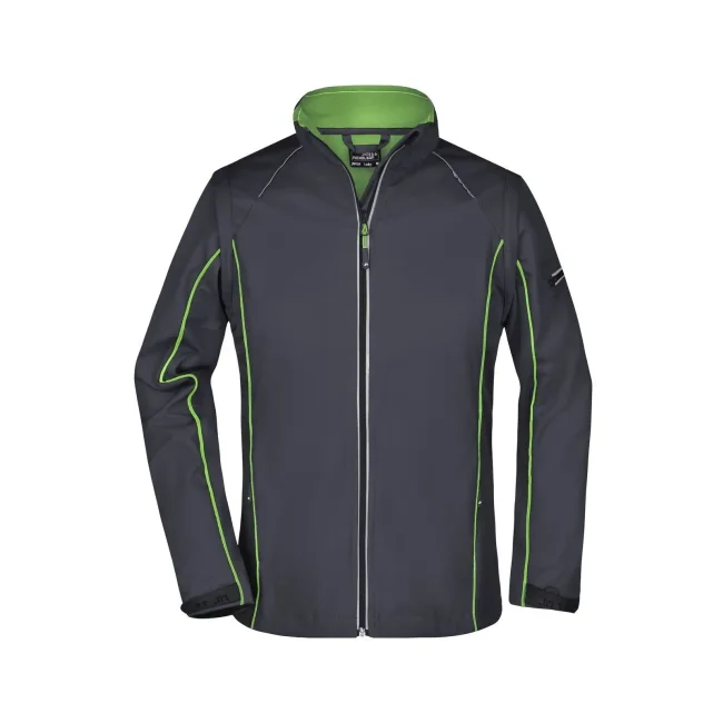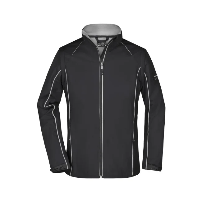 100% poliestere. Giacca in softshell, tessuto a tre strati con membrana tpu, antivento e idrorepellente (colonna d'acqua 5.000 mm), traspirante e permeabile al vapore. Collo alto, piping in contrasto sul davanti, sul retro e sulle maniche. Zip anteriore nascosta, dettagli riflettenti su spalle, retro e maniche. due tasche laterali con zip, una tasca interna, tasca sulla manica con zip riflettente. Maniche staccabili.