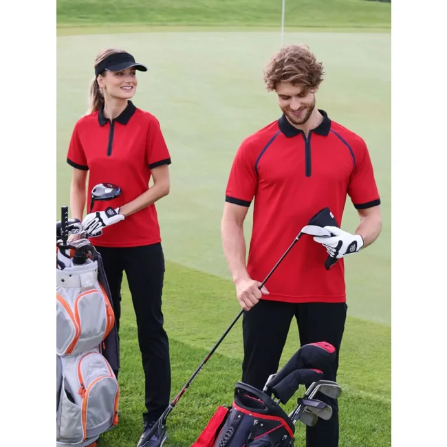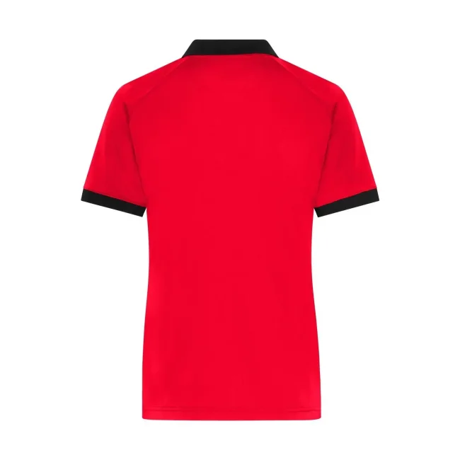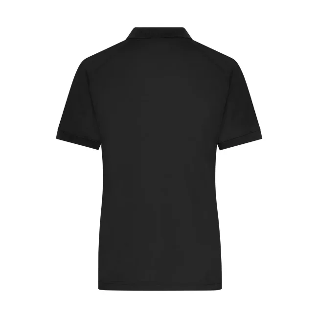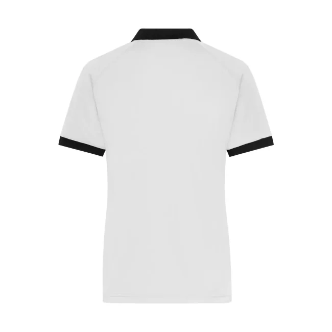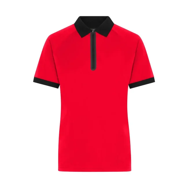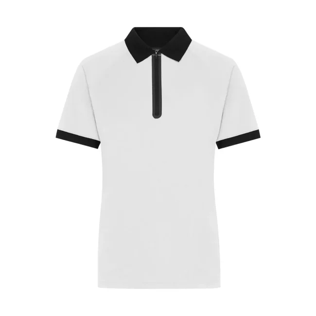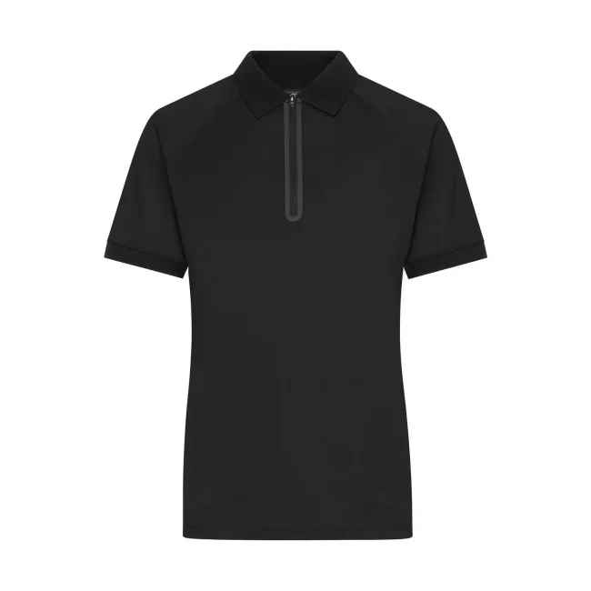 100% poliestere. Polo donna in poliestere con zip YKK, funzionale per sport e tempo libero, traspirante e ad asciugatura rapida, colletto e polisini in maglia, fettuccia sul collo, maniche raglan.