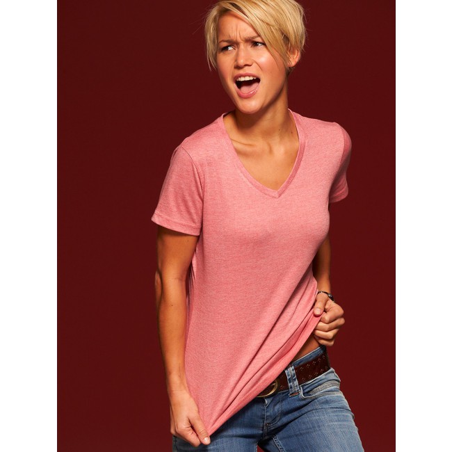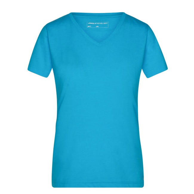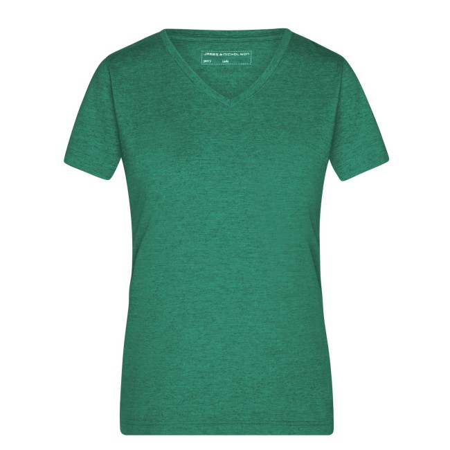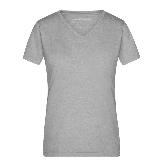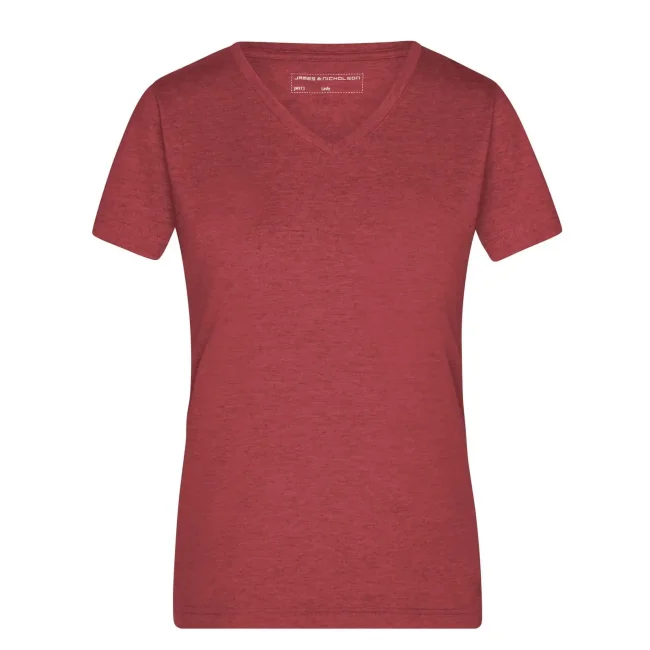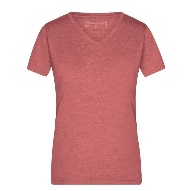 65% poliestere, 35% cotone. T-shirt alla moda con scollatura a V Melange di single jersey di alta qualità, Taglio disinvolto e comodo, Collo a V con elastan, forma avvitata. Tessuto esterno (170 g/m²).