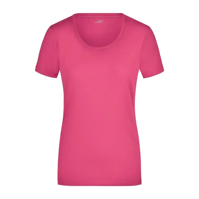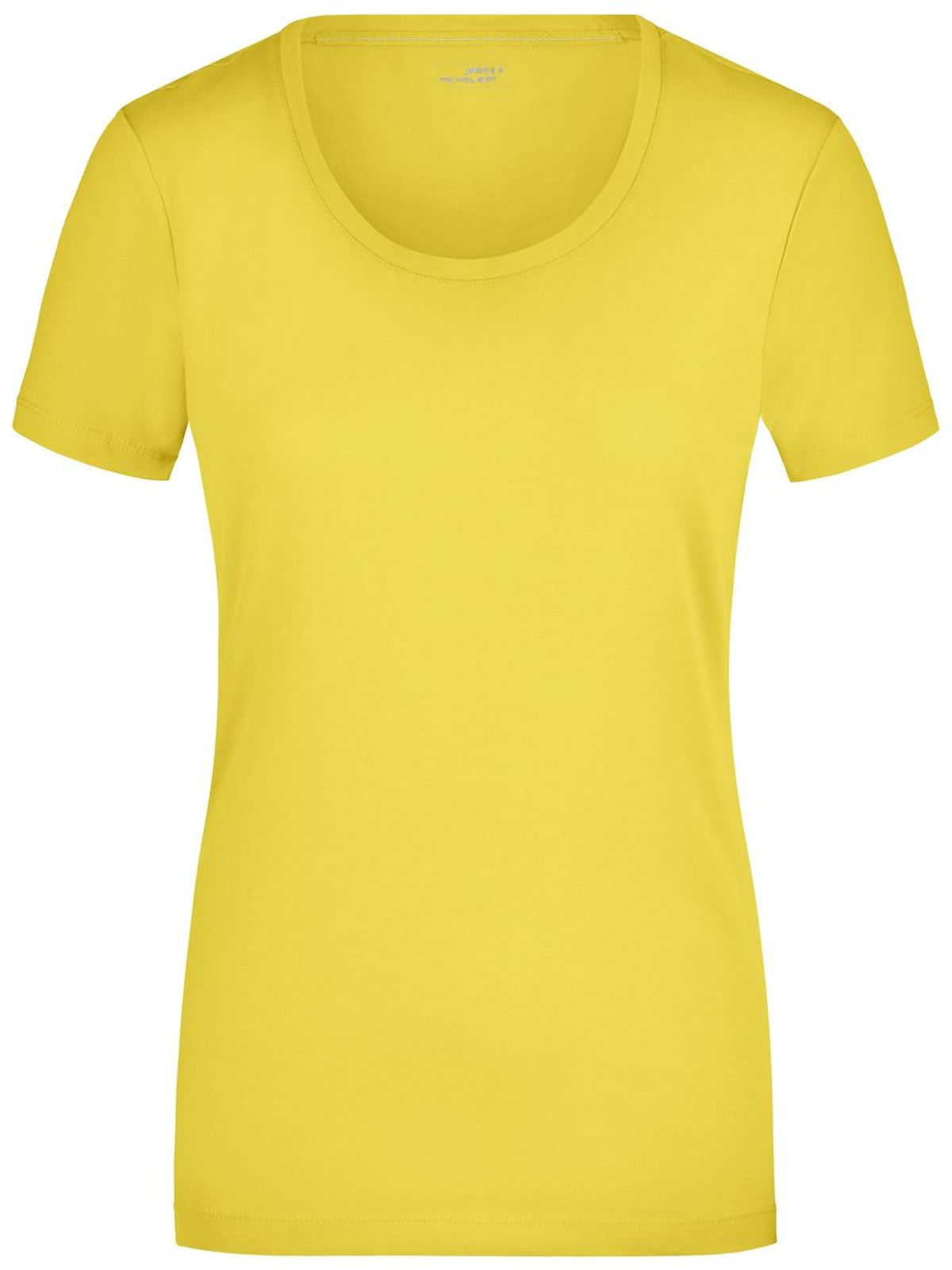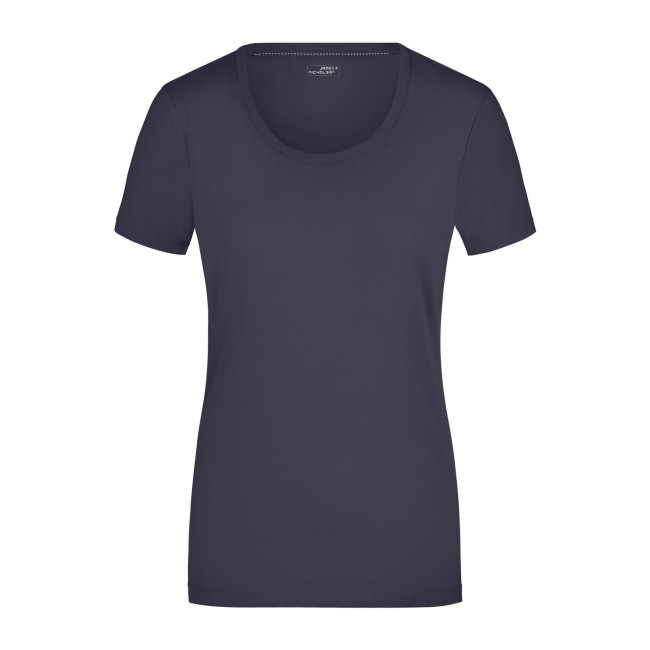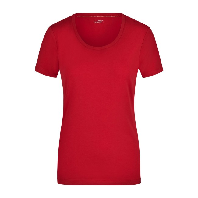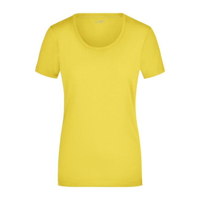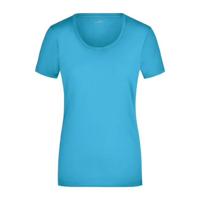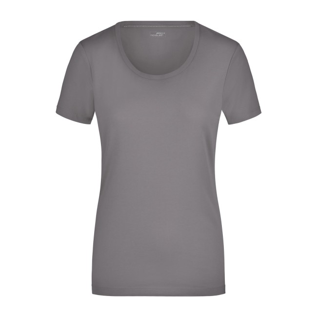 95% cotone, 5% elastane. T-shirt da donna in tessuto elasticizzato, Taglio sciancrato, ampio scollo con bordino stretto. sciancrato.