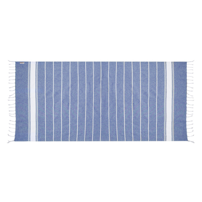 Morbido pareo asciugamano in cotone riciclato al 100% da 180 g/m2. Disponibile in un'ampia gamma di colori in bicolore. Logo sull'etichetta laterale. Presentato singolarmente in una borsa.