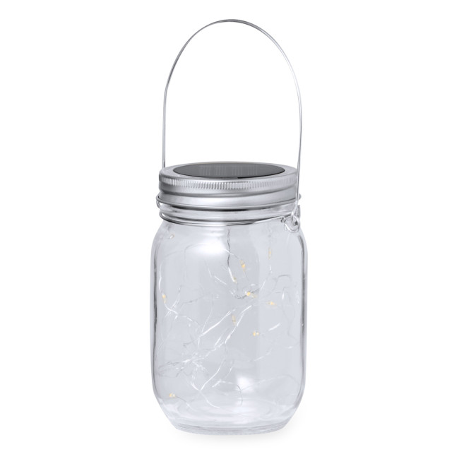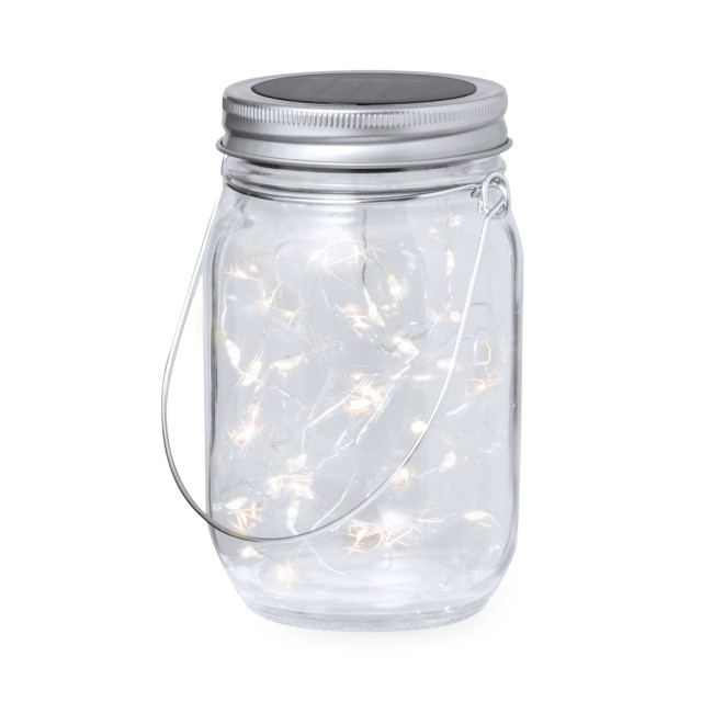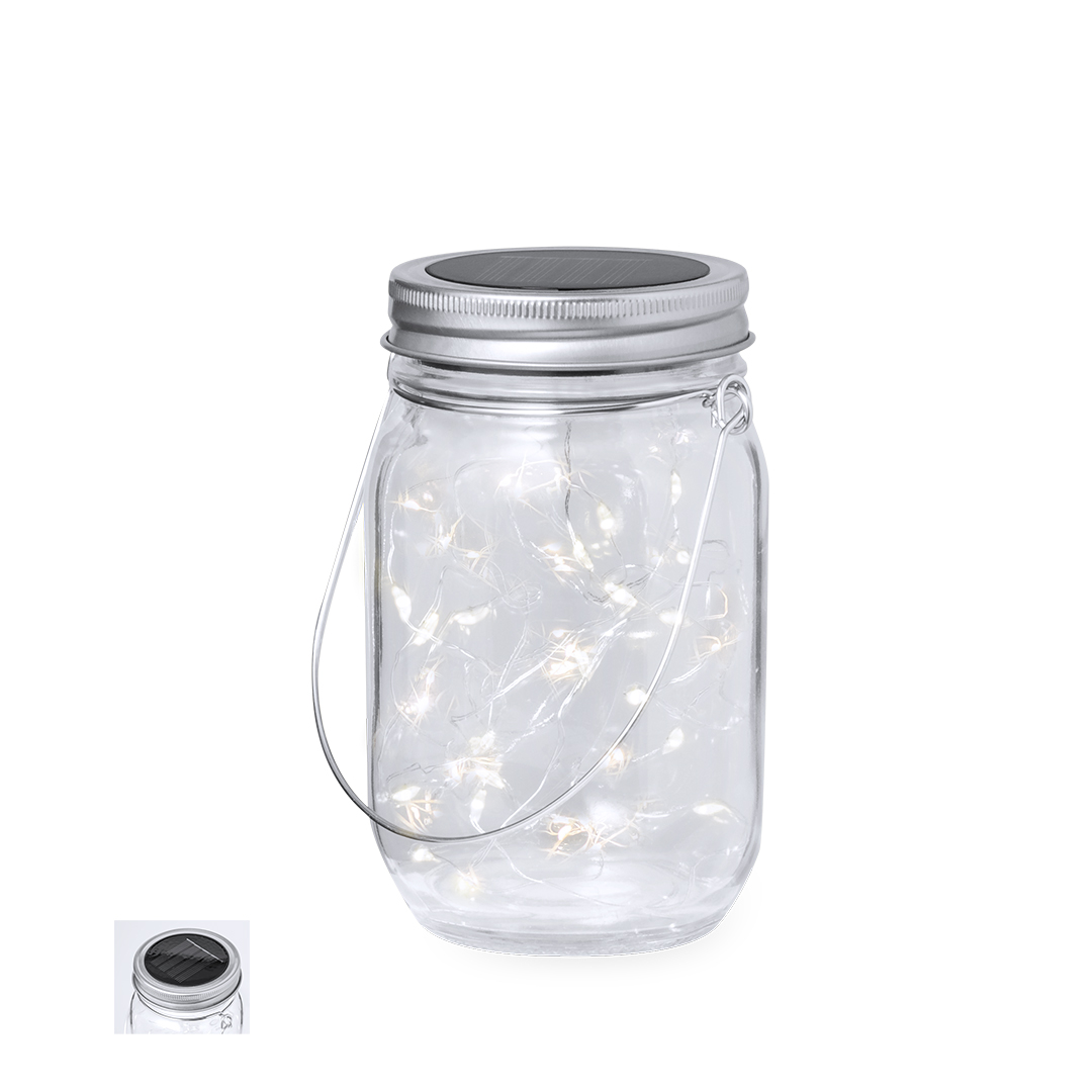 Lampada solare a barattolo, realizzata in resistente materiale di vetro, dotata di una striscia interna decorativa di 20 LED. Include un coperchio a vite in metallo con mini-pannello solare ricaricabile integrato e una batteria ricaricabile da 300 mAh. Con un pratico manico per il trasporto o per appenderla, è presentata in una scatola di design kraft individuale.