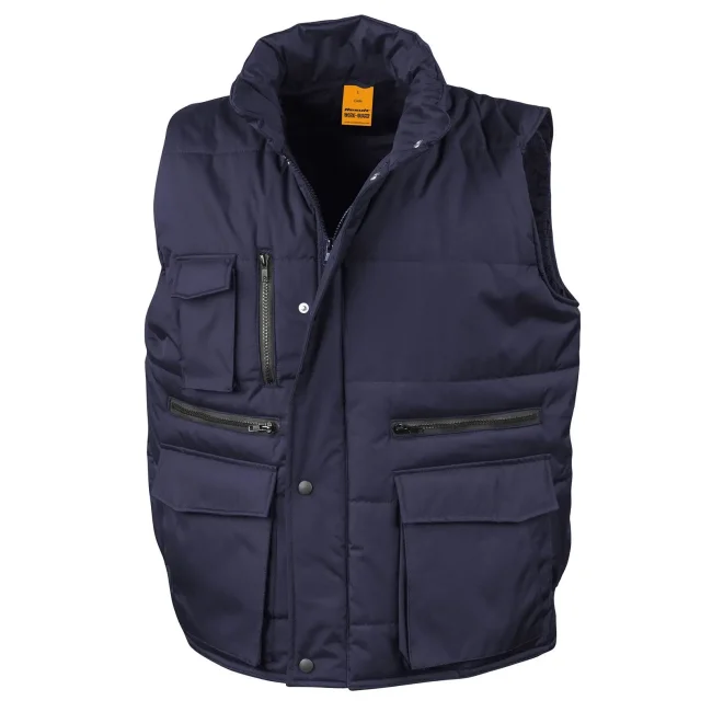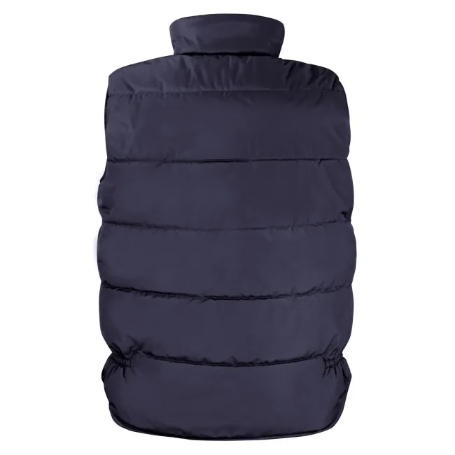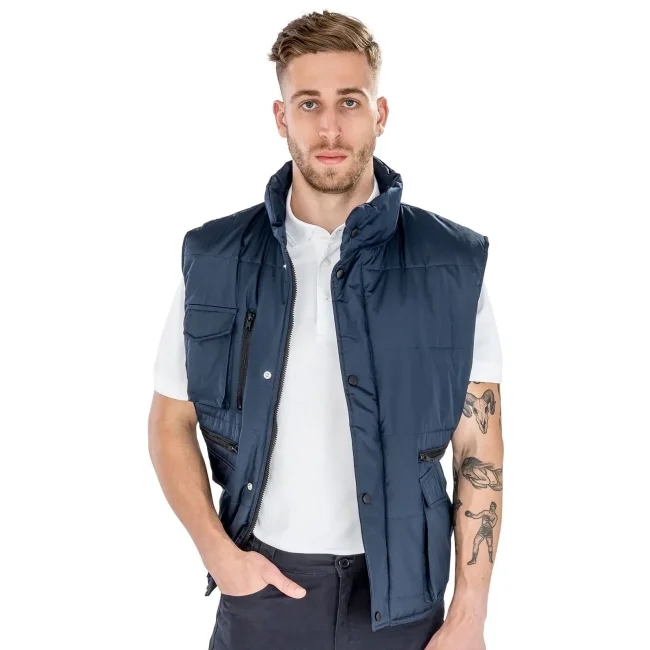 Esterno: 100% poliestere antigraffio con rivestimento in PVC, parte interna: 100% poliestere. Giacca smanicata antivento e resistente all''acqua, doppie cuciture, zip frontale nascosta, 2 tasche frontali, triplo accesso, una tasca pettorale, tasca esterna per cellulare, una tasca interna, ampio giromanica con chiusura elasticizzata, parte posteriore leggermente più lunga.