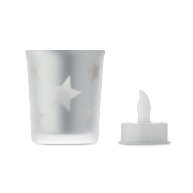 Tealight a LED in PP con candela in vaso di vetro. 1 batteria a bottone CR2032 inclusa.