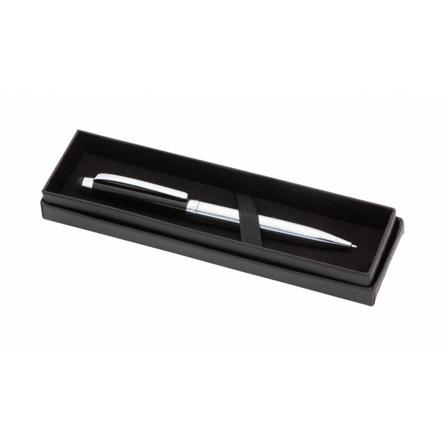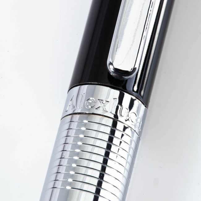 Penna Touch by Alexluca con meccanismo a rotazione e fusto in metallo liscio in un'elegante combinazione di colori argento e nero. Clip e impugnatura dal design coordinato. Presentata in astuccio individuale nero con logo del marchio. Inchiostro blu.