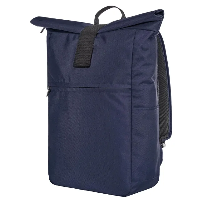 RPET. Materiale esterno RPET. Zaino con risvolto, ampio scomparto principale con chiusura lampo e linguetta con velcro, tasca per notebook imbottita e tasca piatta a inserto interna, ampia tasca anteriore con chiusura lampo, due tasche laterali a inserto, spallacci imbottiti, con manico.