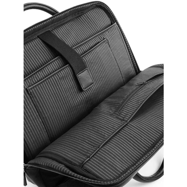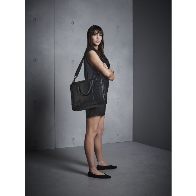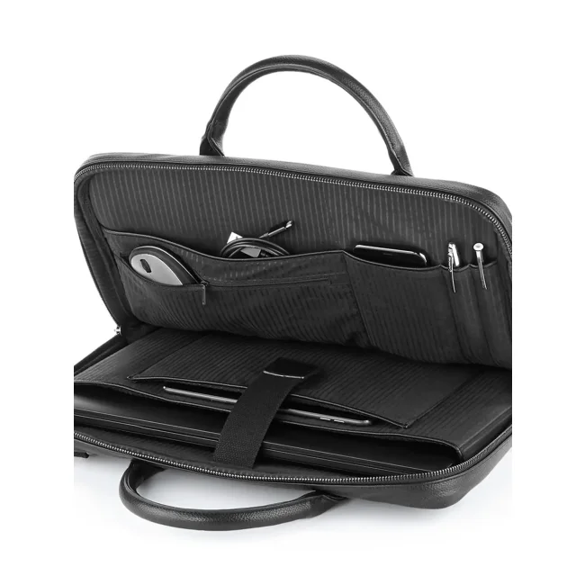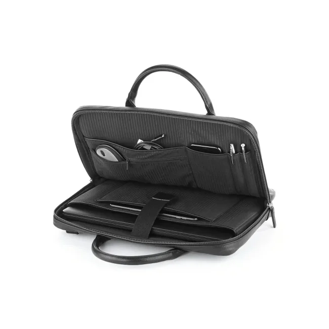 100% simil-pelle NuHide PU. Borsa con scomparto principale con zip extra-lunga, manici in tessuto, scomparto imbottito per laptop fino a 15.6", completamente foderato in tessuto gessato, tasca interna con cerniera. Dimensioni: 41x30x7 cm, capacità: 9 litri, area di stampa massima: 14x16 cm