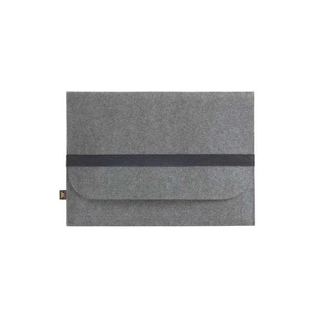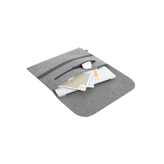 100% feltro. Custodia per laptop, tasca anteriore con chiusura lampo, nastro elastico per chiudere la cartella. Dimensioni: 42x30/54,5 cm. Area personalizzabile: sulla patta 36x18 cm.