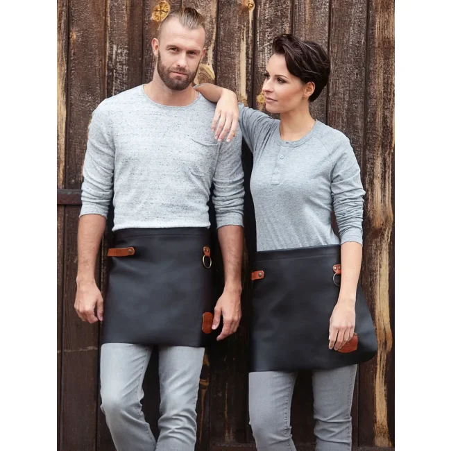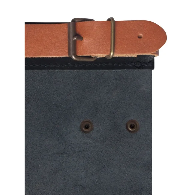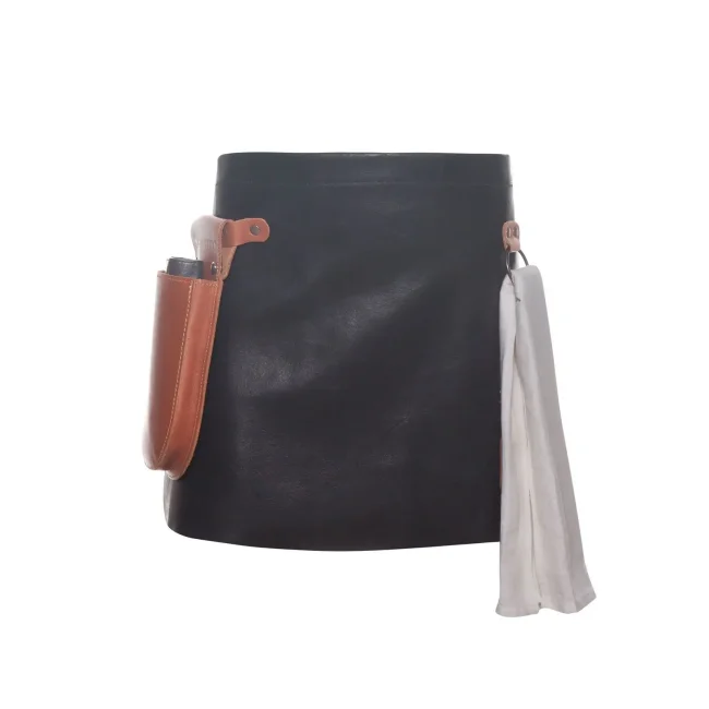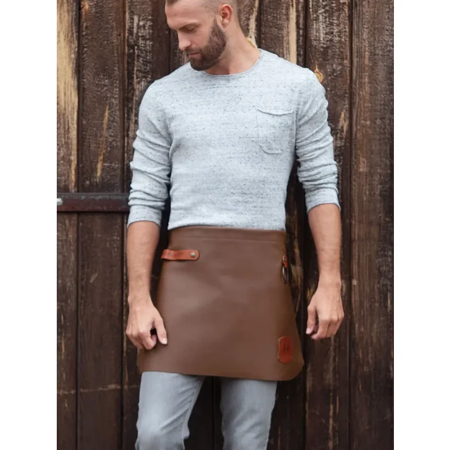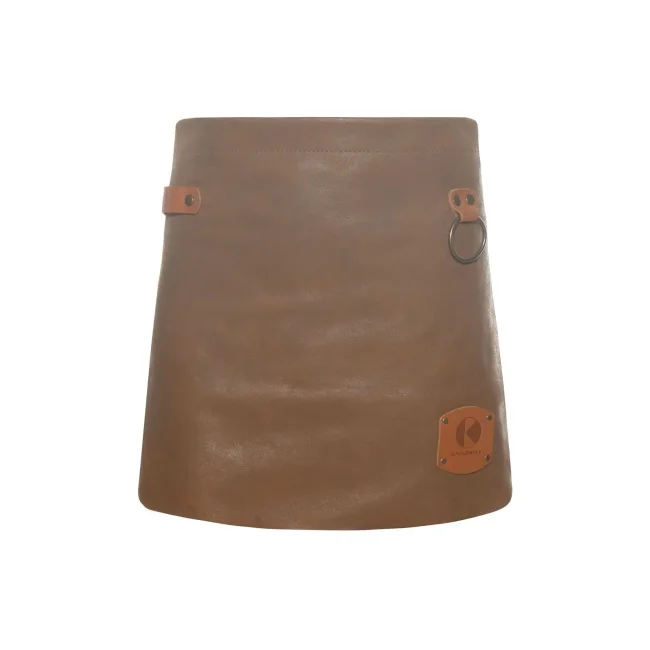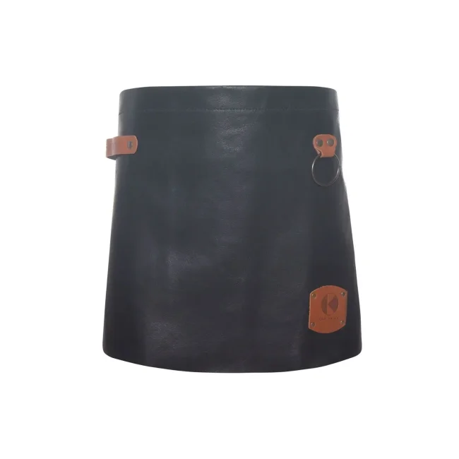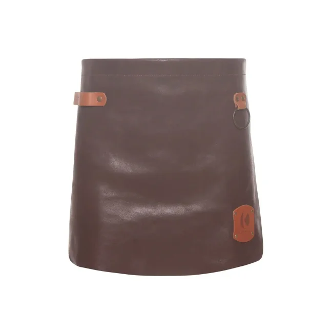 100% pelle bovina. Morbido grembiule con applicazioni in pelle colorata e borchie di metallo color bronzo, cinturino del grembiule regolabile con 10 fori, laccetto in pelle di colore cognac sul lato desto anteriore, pratico anello di metallo sul lato sinistro. Dimensioni: 59 x 40 cm.
