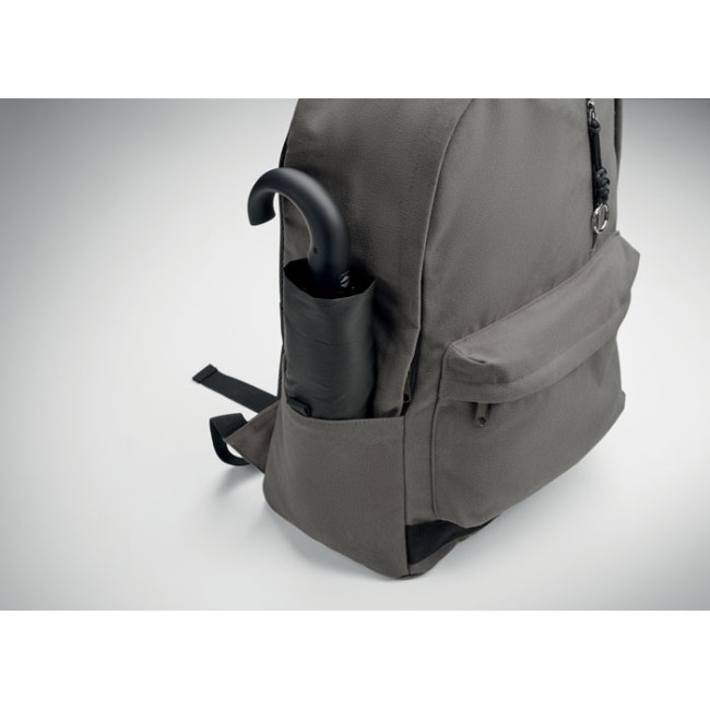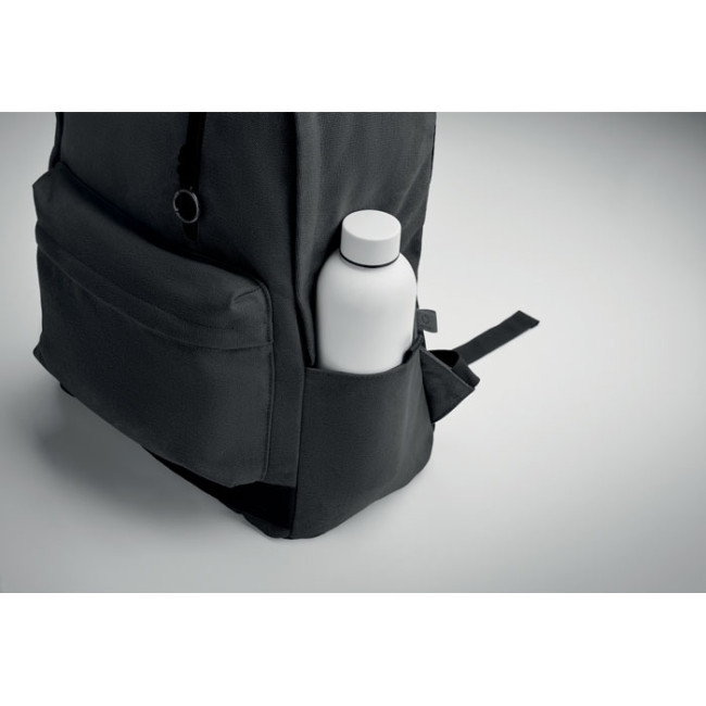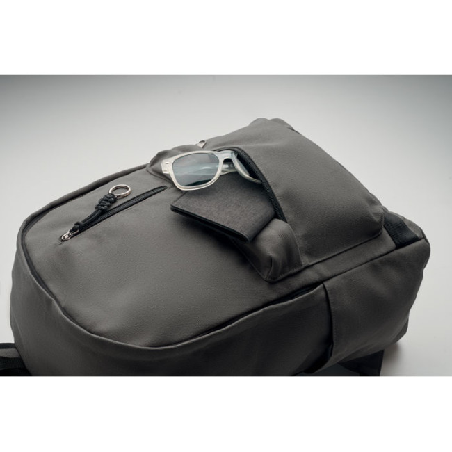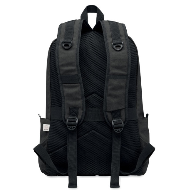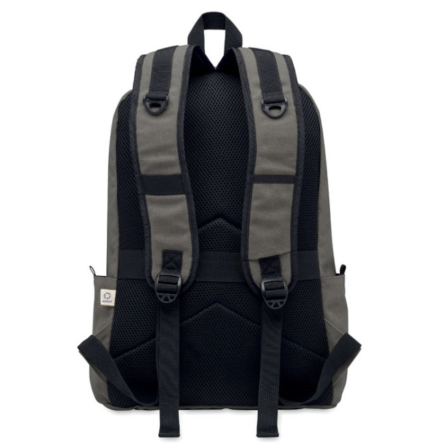 Zaino porta laptop da 15 pollici in cotone riciclato pre-consumo. Ampia tasca frontale con cerniera con scomparto interno per laptop. Piccola tasca frontale con cerniera. Due tasche laterali a bustina. Schienale e spallacci, pannello posteriore e fondo imbottiti. 450 gr