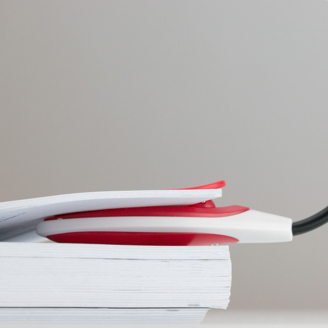 Lampada da lettura a LED dal design bicolore. Con corpo flessibile e comodo morsetto. Presentata in una scatola individuale.
