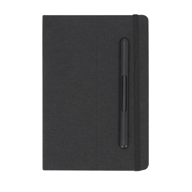 Notepad con copertine rigide realizzate in 600D RPET. Supporto versatile integrato nella copertina. Include la penna a matita eterna. Contiene 96 fogli interni disponibili con una striscia. Ha una chiusura elastica. Con il logo RPET.