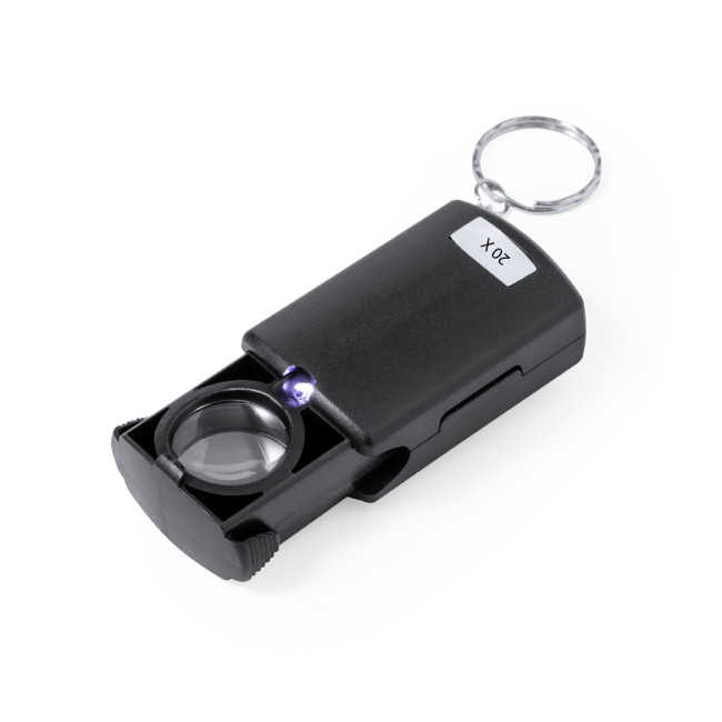 Lente d'ingrandimento portachiavi 20x, realizzata in resistente ABS nero, dotata di luce LED integrata. Facile da trasportare grazie alle dimensioni ridotte, è alimentata da una batteria a bottone inclusa e presentata in una scatola di cartone nera individuale.