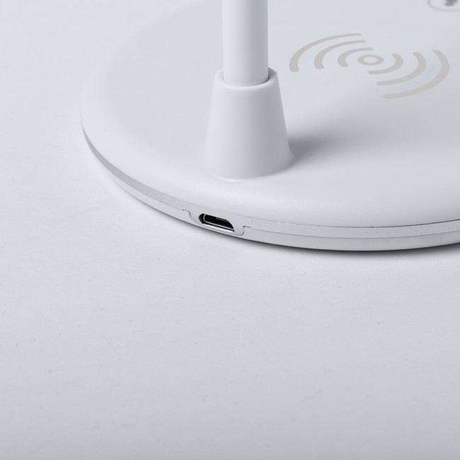 Lampada multifunzione all-in-one in finitura bianca, con altoparlante Bluetooth® 4.2 integrato da 3W e caricatore wireless. 14 LED e 3 posizioni di illuminazione (calda, fredda e media), regolabile in altezza. Compatibile con i dispositivi mobili a ricarica wireless, con cavo di ricarica micro USB e fornita in un'attraente scatola di design.