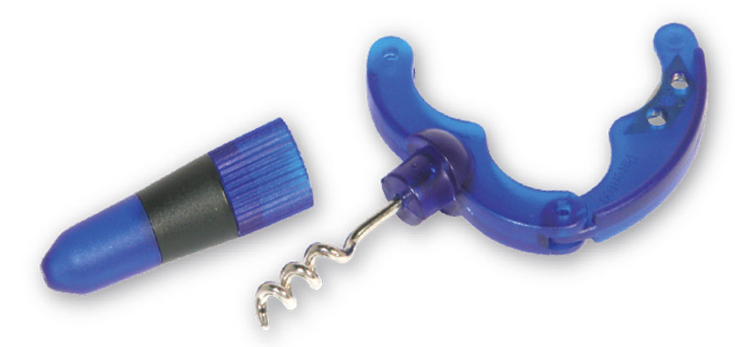 Levacapsule con cavatappi realizzato in plastica satinata blu, progettato per aprire bottiglie con facilità. Questo accessorio è pratico e funzionale, rendendolo un must-have per ogni occasione. Un attrezzo semplice ma efficace per ogni amante del vino.