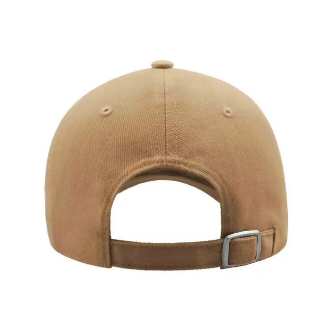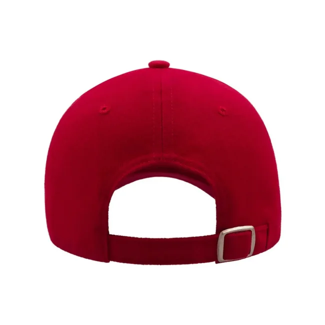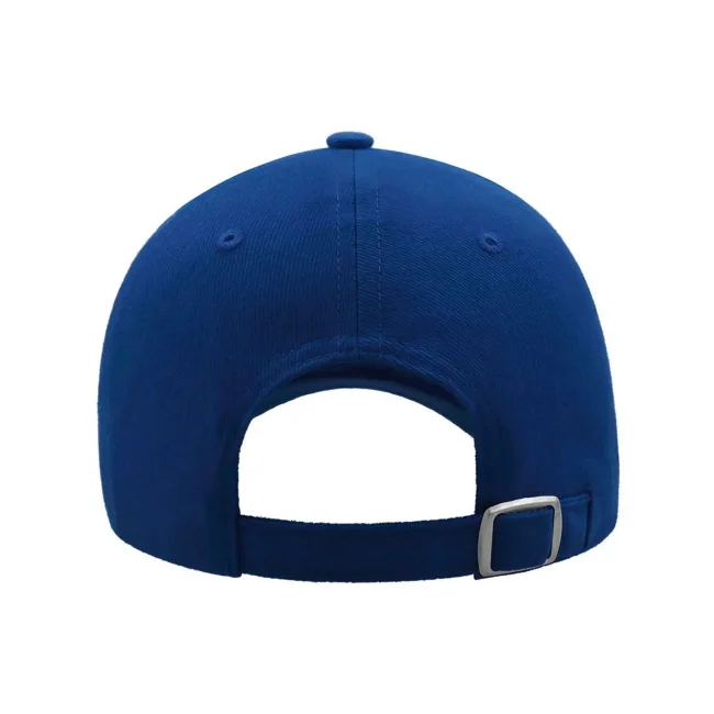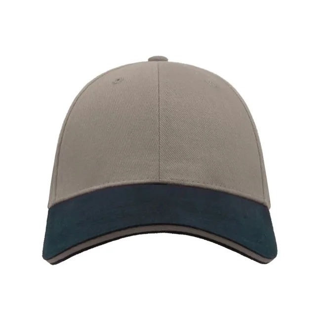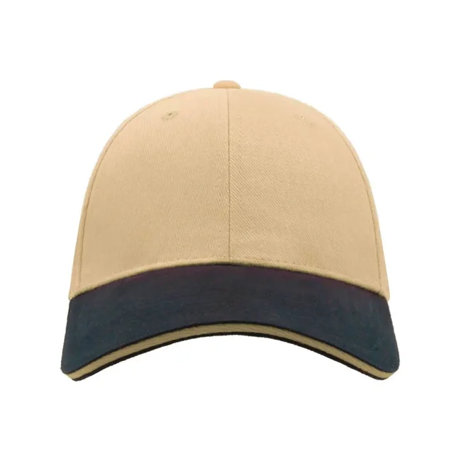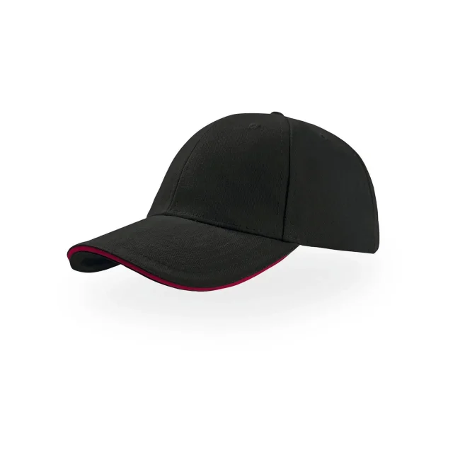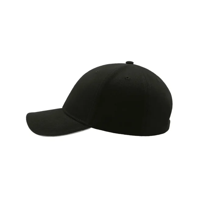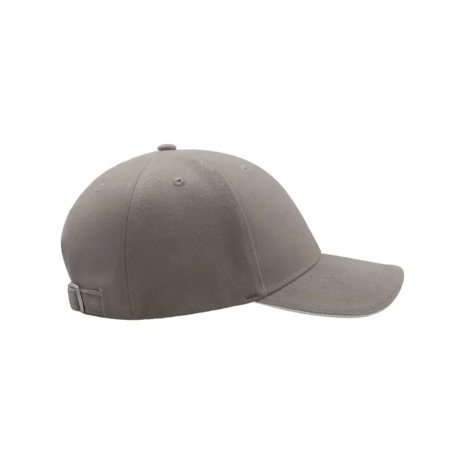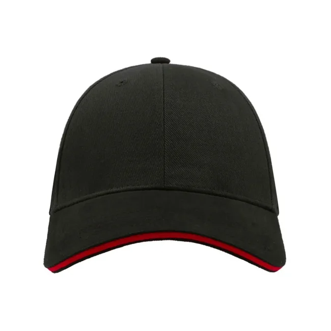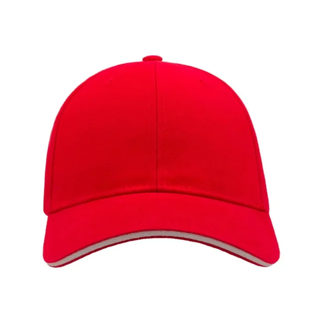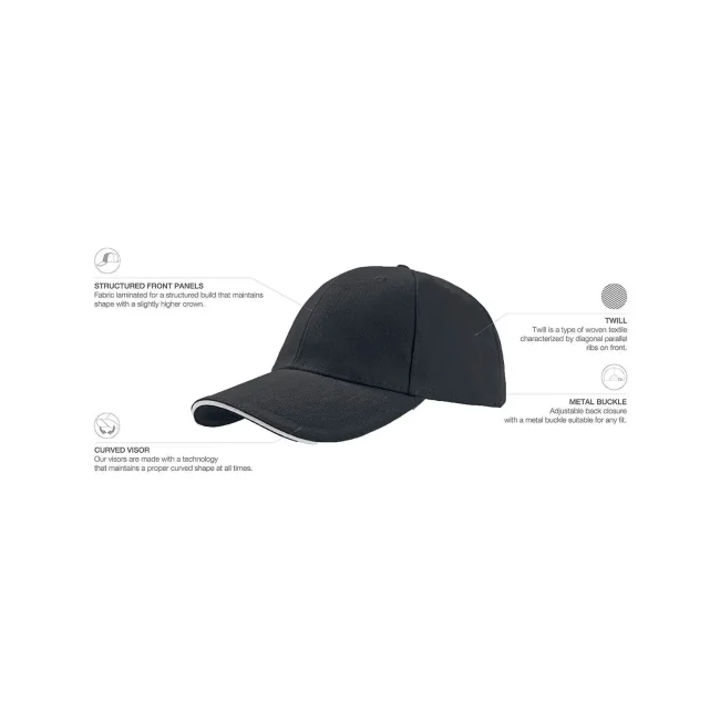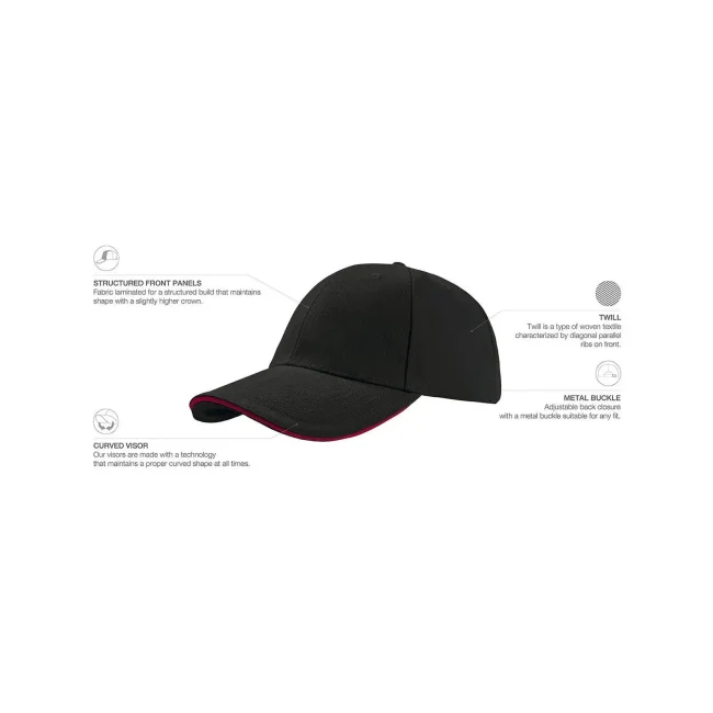 100% cotone. Cappellino a 6 pannelli, visiera tipo sandwich con inserto a contrasto, chiusura con cinturino passante su fibbia in metallo, occhiello ricamato, etichetta removibile, taglia unica.