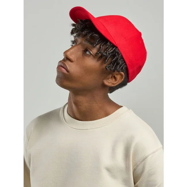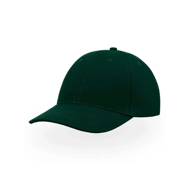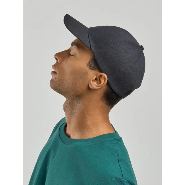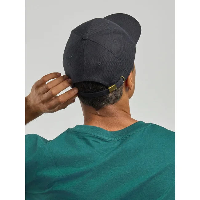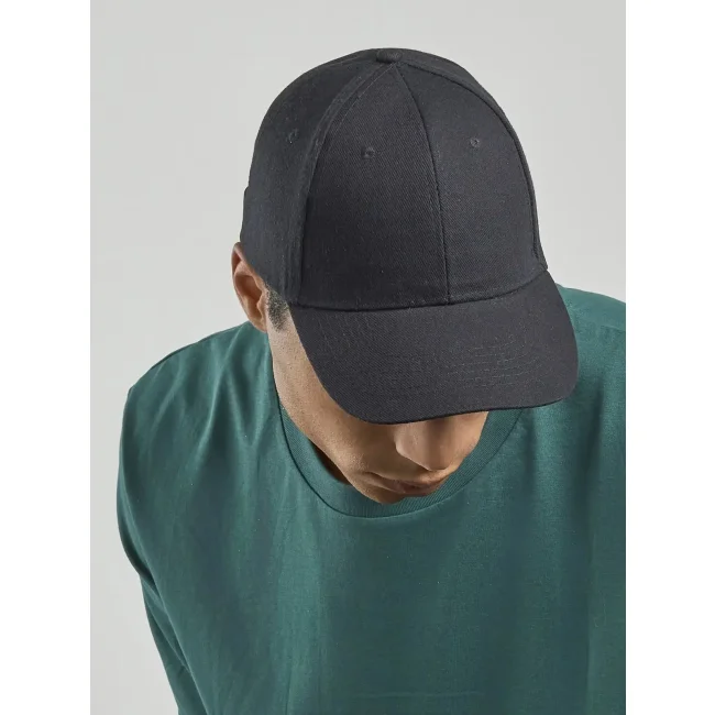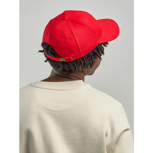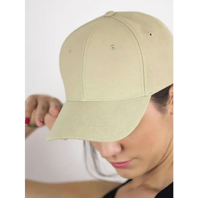 100% cotone pesante spazzolato. Cappellino a 6 pannelli, chiusura con fibbia e foro in metallo, parasudore in poliestere, occhielli ricamati, pannello frontale rinforzato, visiera pre- curvata, 6 cuciture su visiera, taglia unica.