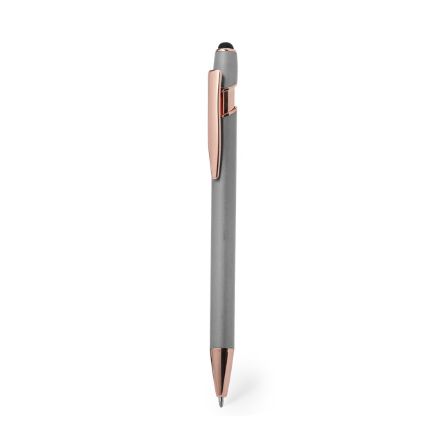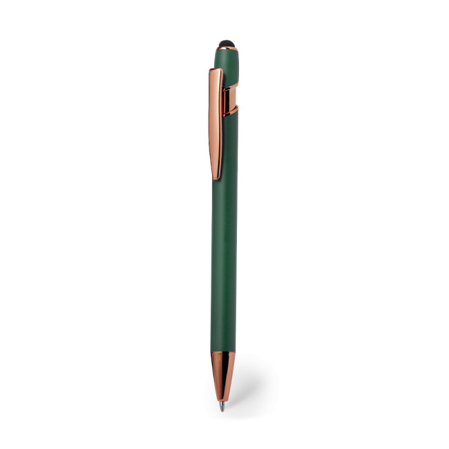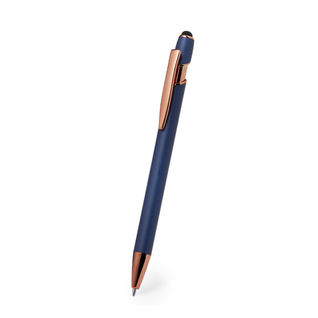 Eccellente penna touch in alluminio con meccanismo a pulsante. Robusto fusto in alluminio opaco con elementi decorativi in elegante finitura color rame, con fusto in un'ampia gamma di colori distintivi. Clip in metallo, con pulsante a scomparsa e puntatore touch nero nella parte superiore. Inchiostro blu.