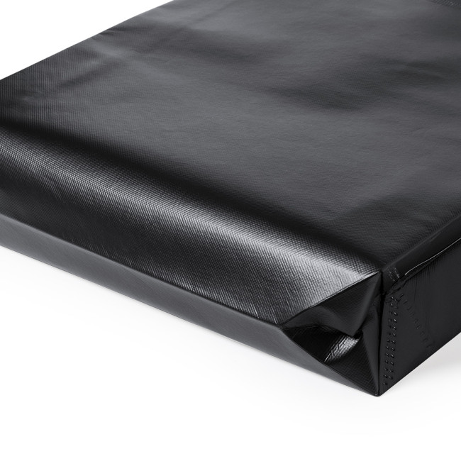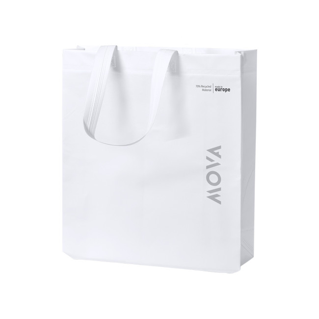 Borsa della linea Natura, realizzata in TNT riciclato 120g/m2 laminato. Prodotta in Europa, con finitura termosaldata, soffietto, manici lunghi ed etichetta eco/made in sulla borsa.