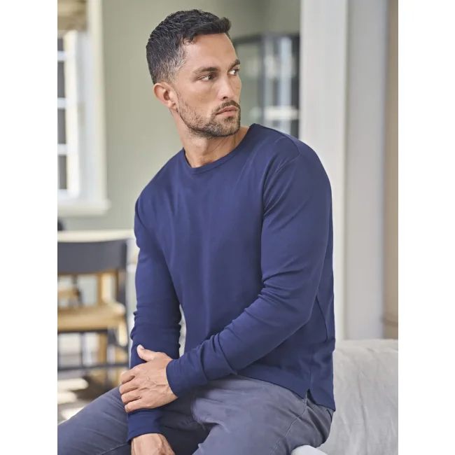 100% cotone pettinato ring-spun. T-shirt uomo maniche lunghe, cotone a fibra lunga, tessuto più compatto, lavaggio con enzimi e silicone per un tessuto più soffice, doppia cucitura, taglio attillato.