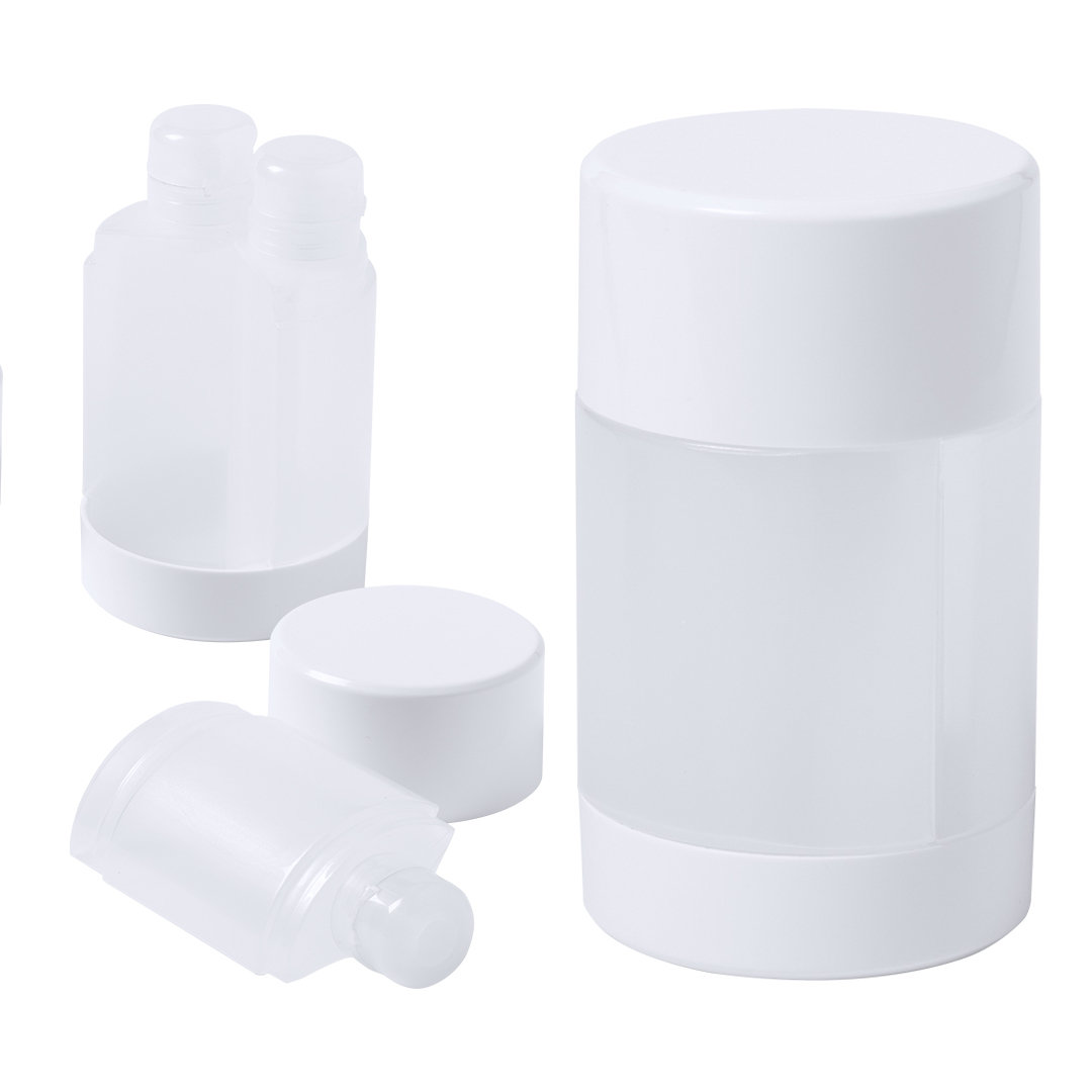 Set da viaggio di 3 accessori in PP resistente. Include 3 flaconi per gel e shampoo con chiusura ermetica. Presentato in una scatola di design originale.