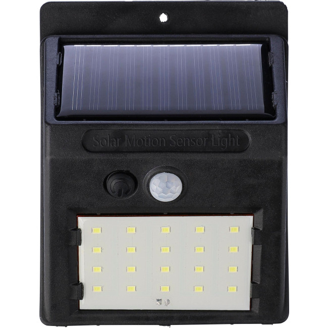 Luce solare in PP con LED 20-COB. Dispone di un sensore notturno (CDS) e di un sensore di movimento (PIR). Include una batteria da 800 mAh, con un cavo di ricarica, classificazione IP44 e funzioni di luce costante o lampeggiante. Confezionata singolarmente in una scatola di cartone avana.