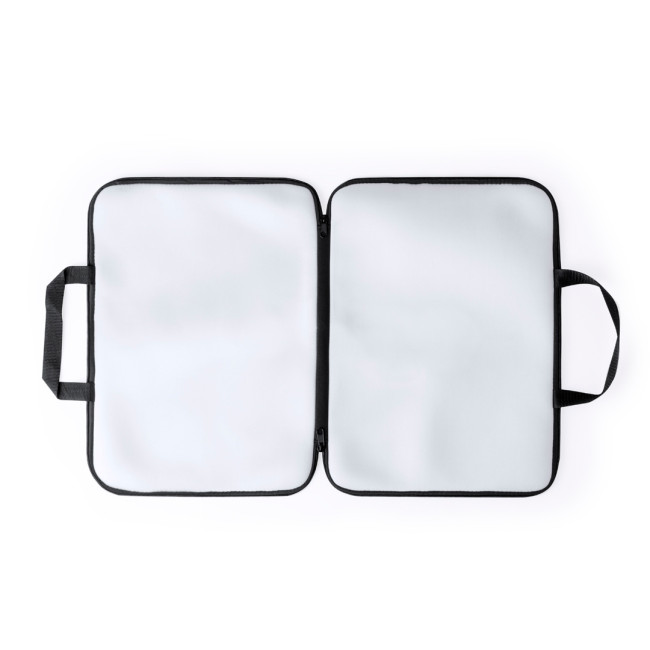 Pratica custodia per notebook fino a 15" in guscio morbido. Appositamente progettata per la sublimazione, con due ampi lati per la stampa, chiusura a zip nera a doppio cursore e due manici. Confezionata singolarmente in un sacchetto riciclato.