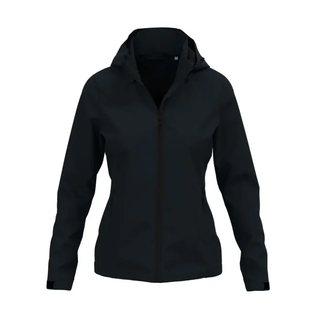 100% poliestere. Giacca softshell donna con tessuto a 3 strati impermeabile (5.000 mm) e traspirante (1.000 g/m²), mezzaluna centrale posteriore per la personalizzazione, polsini e orlo regolabili, tasca interna, cappuccio rimovibile e regolabile, 2 tasche laterali con cerniere di alta qualita', bordo di protezione dal vento, etichetta Premium con la taglia tessuta sulla nuca, ed etichetta di manutenzione a strappo nella cucitura laterale, senza fluoro e PFC.