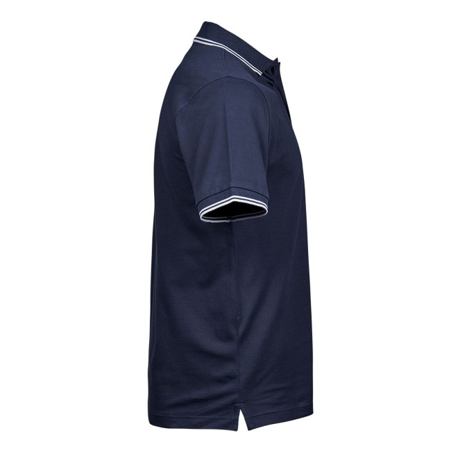 95% cotone ring-spun, 5% elastane. Polo a maniche corte, mini piqué, doppie righe di colore contrastante su colletto e polsini, struttura con cuciture e spacchetti laterali, 3 bottoni tono su tono.