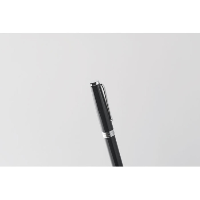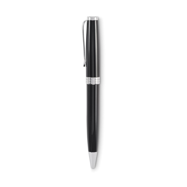 Penna a sfera a rotazione con fusto in acciaio inossidabile riciclato. Inchiostro blu. Presentata in una scatola nera.