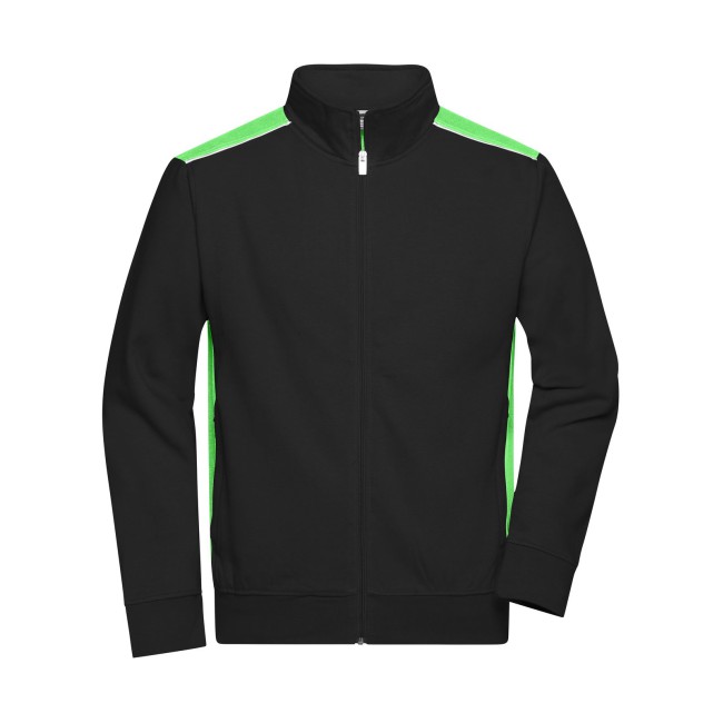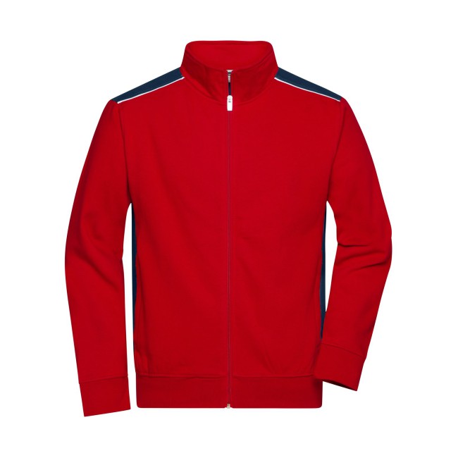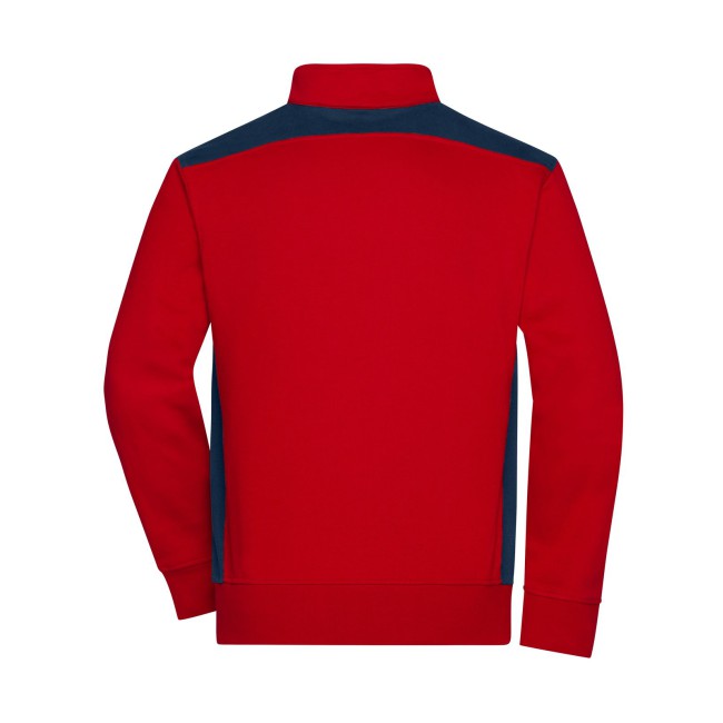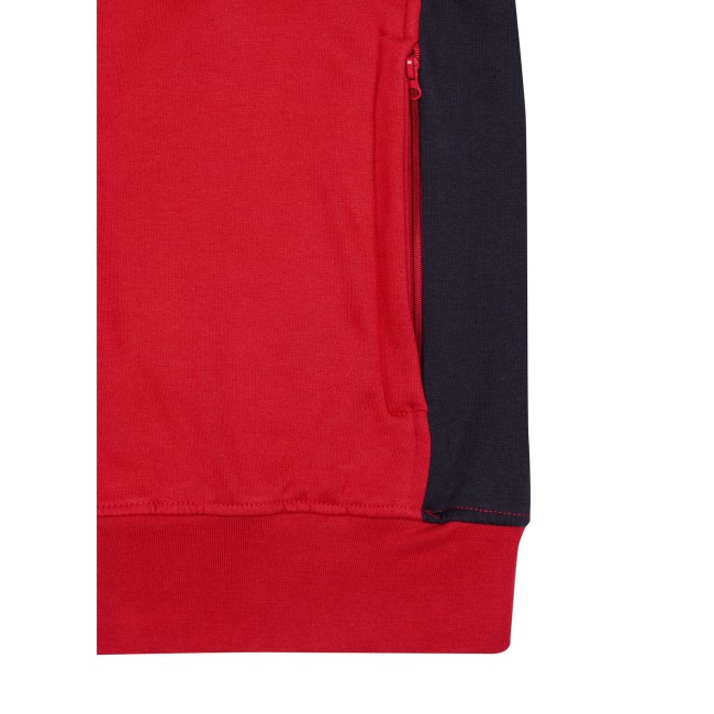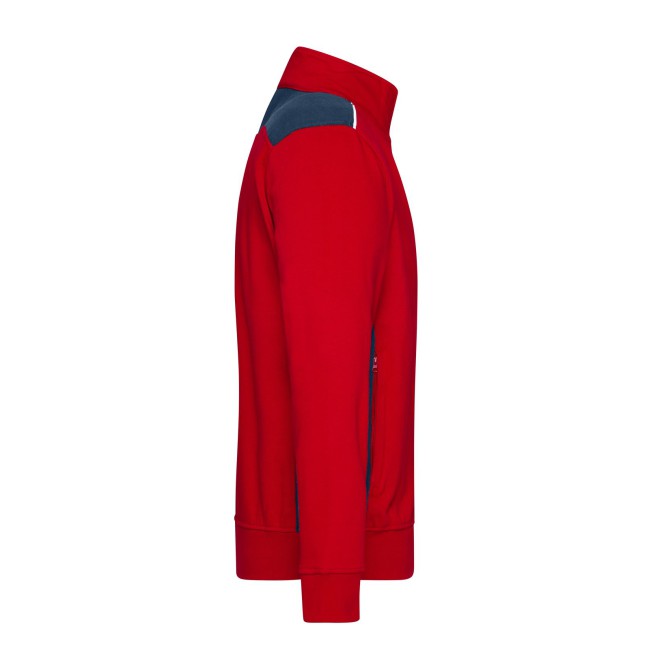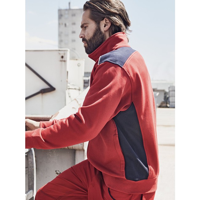 70% cotone, 30% poliestere. Felpa con maniche set-in, resistente, easy care, felpata internamente, inserti contrastanti ai lati e sulle spalle, costina in elastan su maniche e vita, 2 tasche laterali con cerniera nascosta, lavabile a 60°C, adatta ad asciugatrice, struttura con fasce laterali.