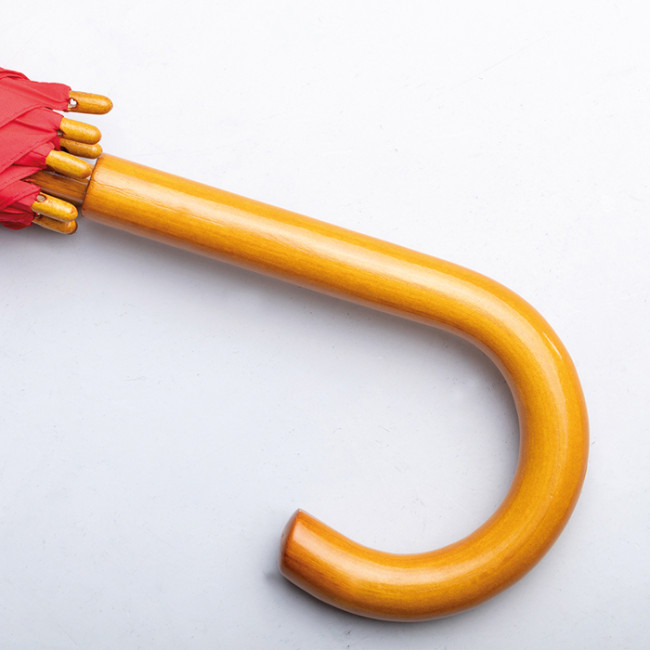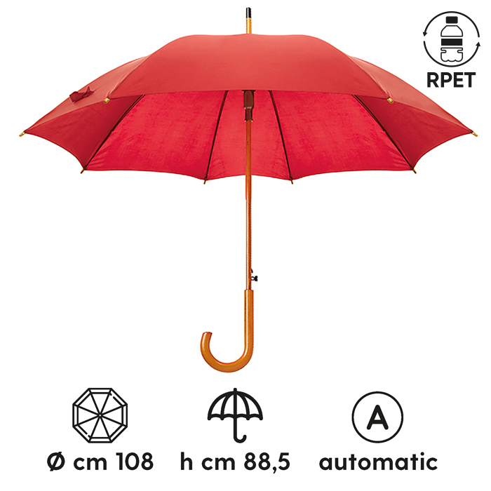 ombrello in RPET sistema di apertura automatica struttura in fibra di vetro fusto e puntale in legno impermeabilizzato manico in legno con finitura opaca chiusura con velcro