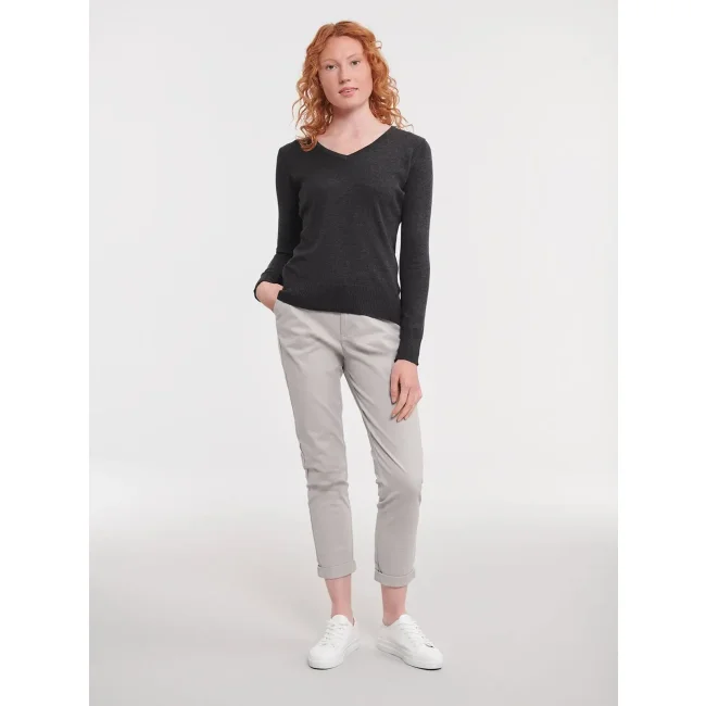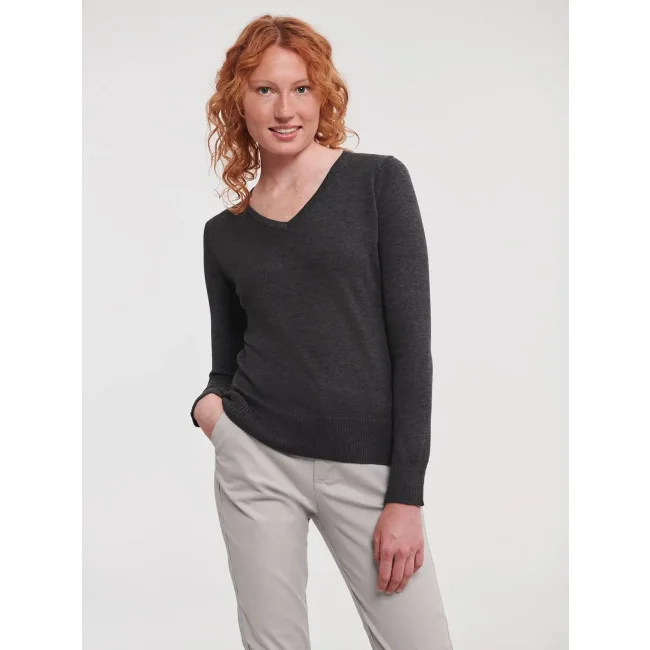 50% cotone, 50% acrilico. Pullover da donna con scollo a V, costina 1X1, polsini e girovita con elastane, maniche a giro, lavabile a 40°C. Cuciture laterali.