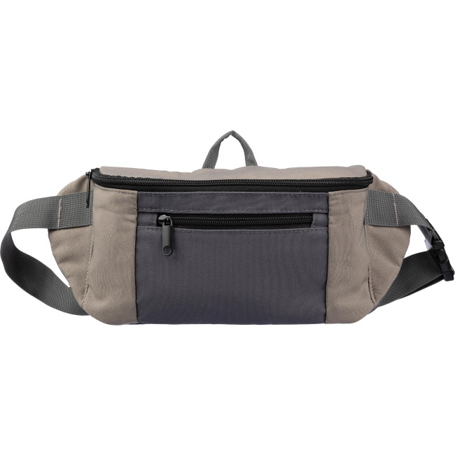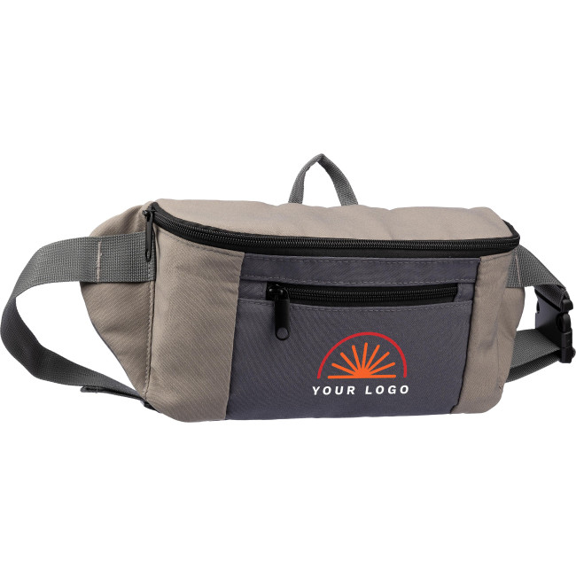 Marsupio in poliestere 600 D (imitazione cotone), fodera in PU 210 D, supporto in schiuma PE 3 mm, ampio scomparto sul lato superiore e tasca sul lato anteriore, entrambe con chiusura lampo, tracolla regolabile con fibbia