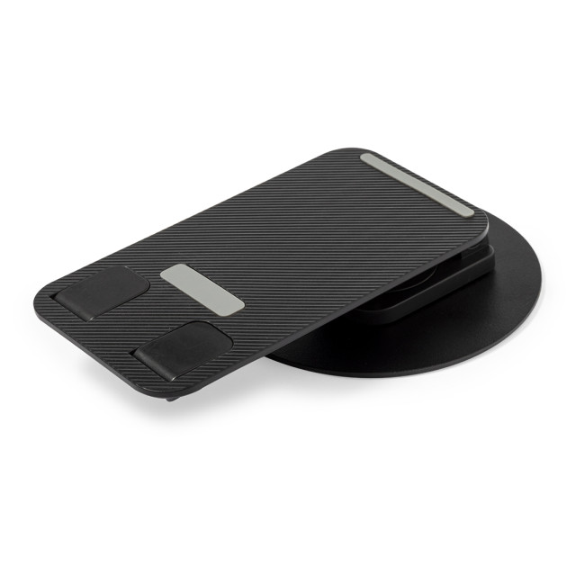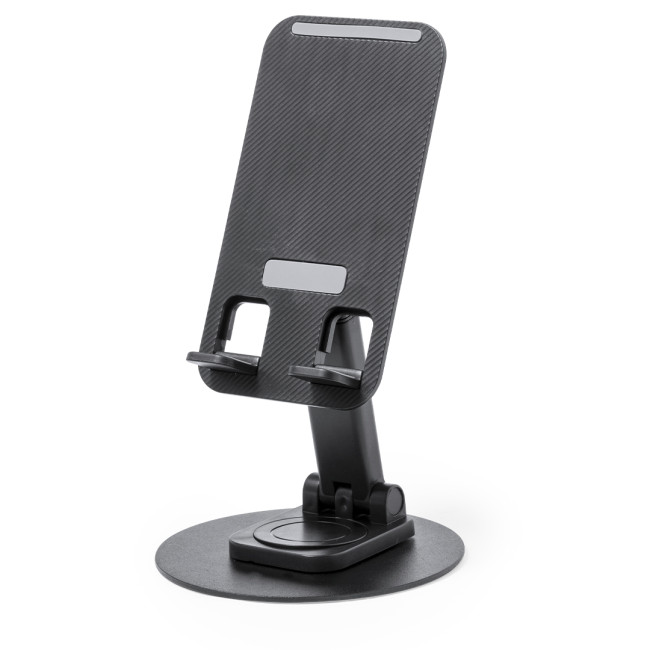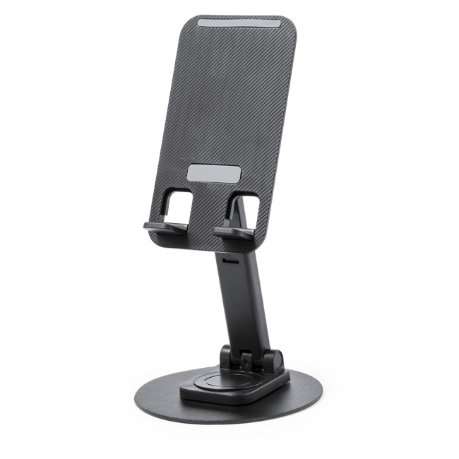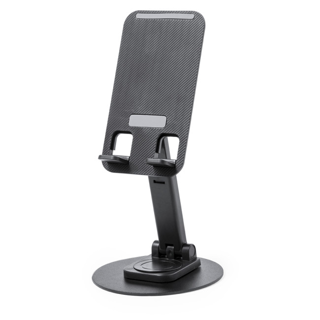 Supporto pieghevole per smartphone e tablet, realizzato in robusto alluminio e ABS. Regolabile in altezza, con gommini antiscivolo sulla base e sul supporto. In sobria finitura bianca o nera, con ampia superficie di stampa. Presentato in una scatola dal design accattivante.