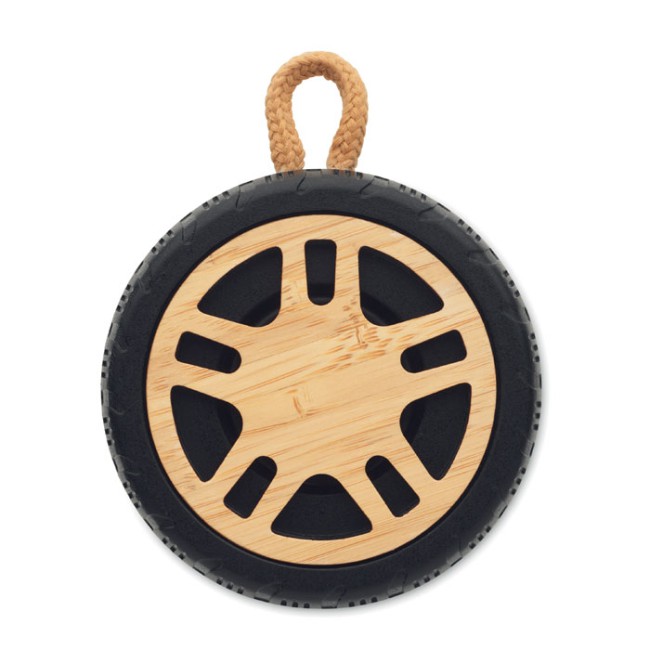 Speaker wireless 5.3 a forma di pneumatico in ABS riciclato con dettagli in bamboo e manico in corda di cotone. Batteria ricaricabile da 400 mAh.