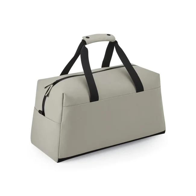 100% poliestere riciclato con rivestimento opaco in poliuretano. Senza PVC. Borsone in tessuto idrorepellente, in stile minamalista, con scomparto principale extra lungo con cerniera, tasca interna con cerniera, pannello di fondo a doppio strato per una maggiore resistenza, manici in fettuccia, involucro porta manici in tessuto, può essere portato a mano o a tracolla, etichetta removibile per cambiare più facilmente il marchio. Dimensioni: 53 x 24 x 27 cm. Capacita': 28 litri.