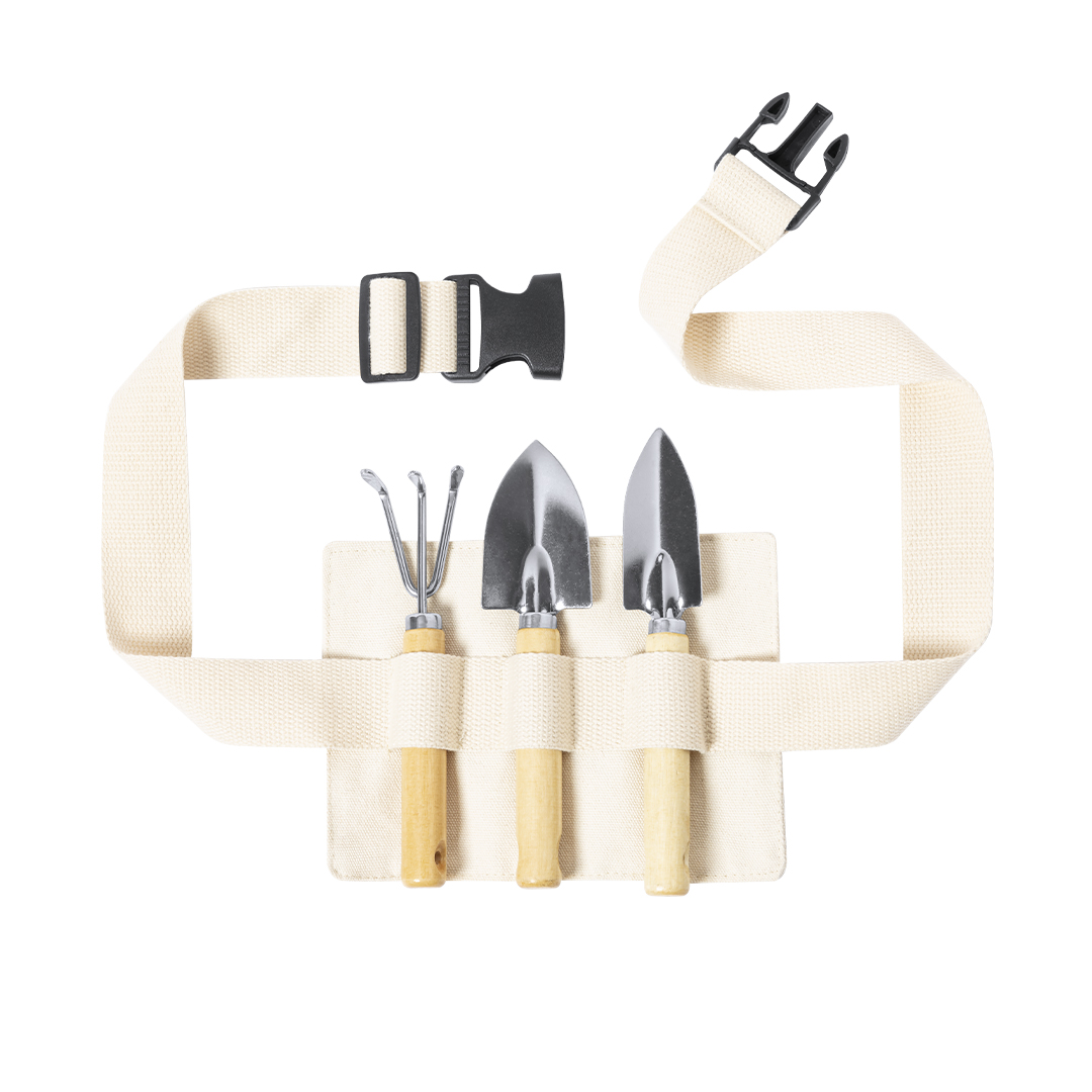 Set da giardinaggio con 3 accessori, in metallo con manico in legno. Include pala grande, pala piccola e rastrello. Custodia in cotone con chiusura a scatto regolabile Confezionato in un'attraente scatola di eco-design.