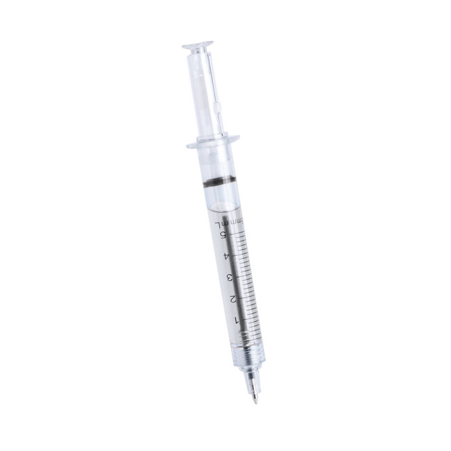 Originale penna a sfera con design a siringa e fusto trasparente. Con liquido interno dai colori vivaci e inchiostro blu.