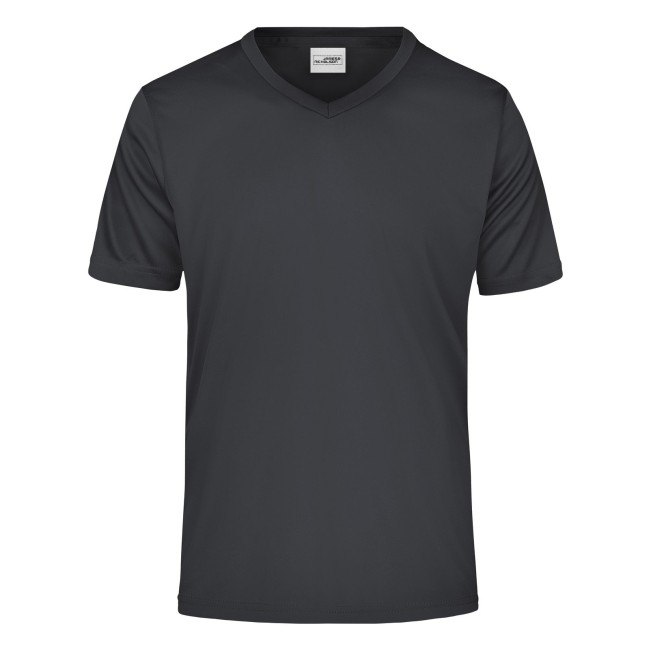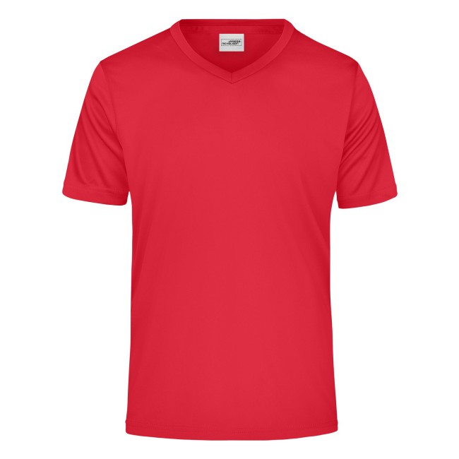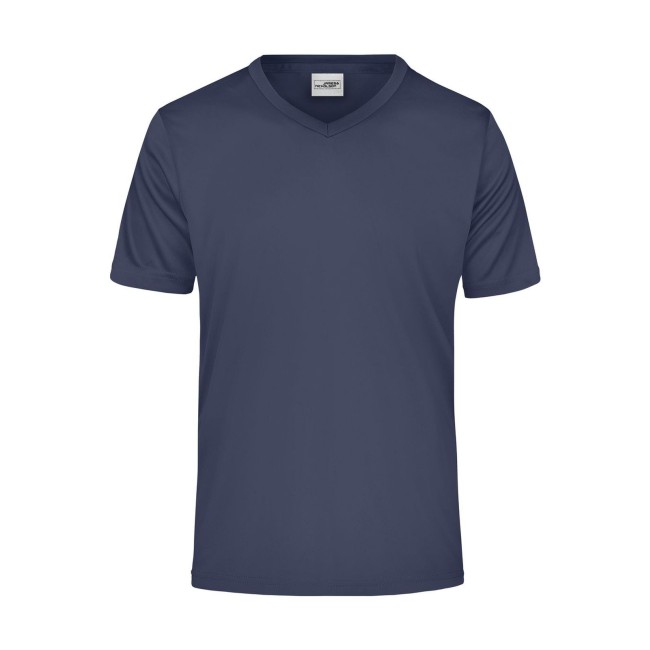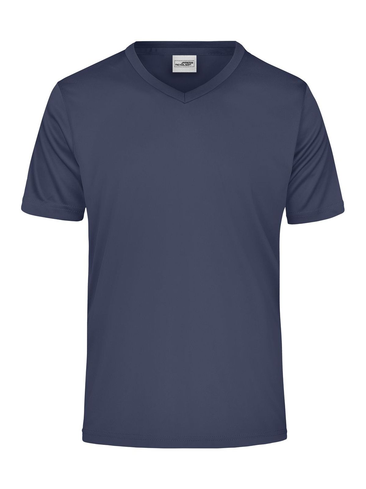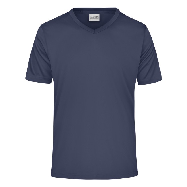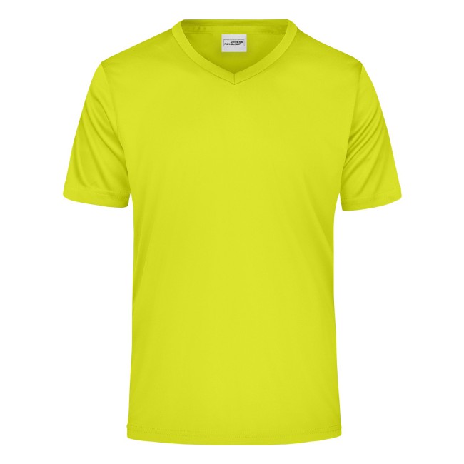 100% poliestere. T-shirt per il tempo libero e sport Single jersey, Scollo a V , parasudore, Cuciture doppie sulle spalle e sul giro manica, Traspirante , autoregolazione dell'umidità, Asciugatura rapida. Tear off!®-etichetta removibile. Tessuto esterno (150 g/m²), manica corta.