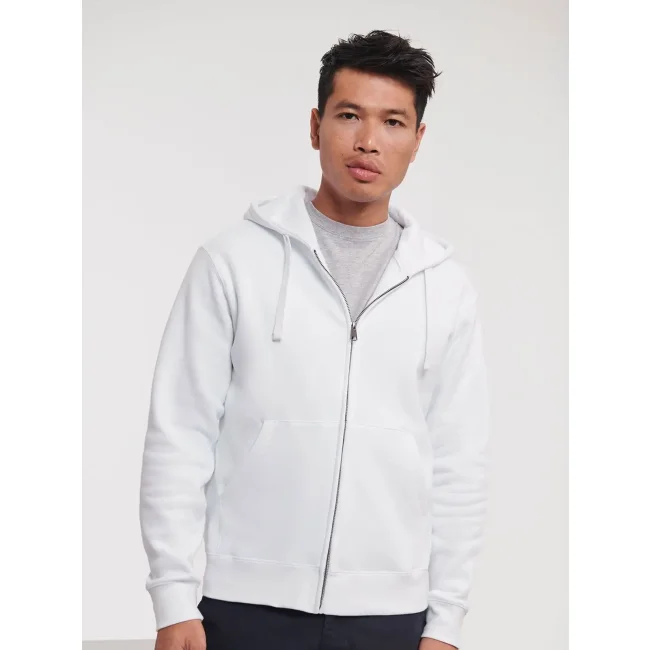 80% cotone ring spun 20% poliestere. Felpa con cerniera, maniche set-in, tasca a marsupio, nastro di rinforzo al collo. Felpata internamente, struttura con cuciture laterali.