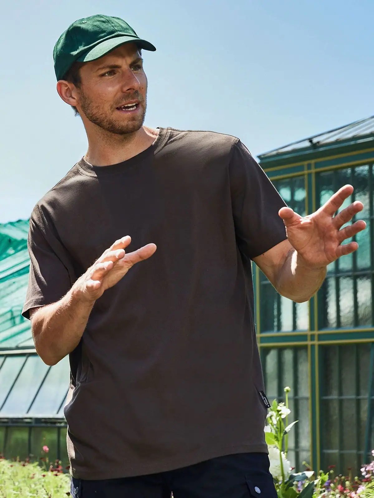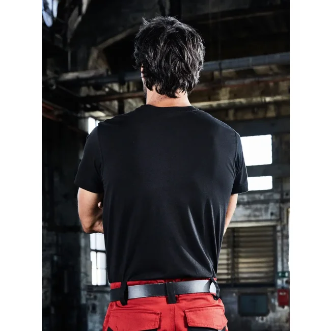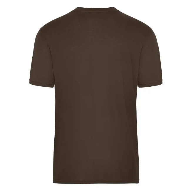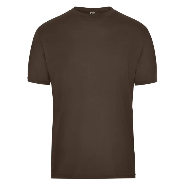 50% cotone 50% poliestere. T-shirt in tessuto misto, cotone organico ring-spun e poliestere per un perfetto mantenimento della forma e resistenza al lavaggio, collo rotondo con elastan, nastro di rinforzo al collo, lavabile a 60ยฐ C, ideale per asciugatura in asciugatrice.